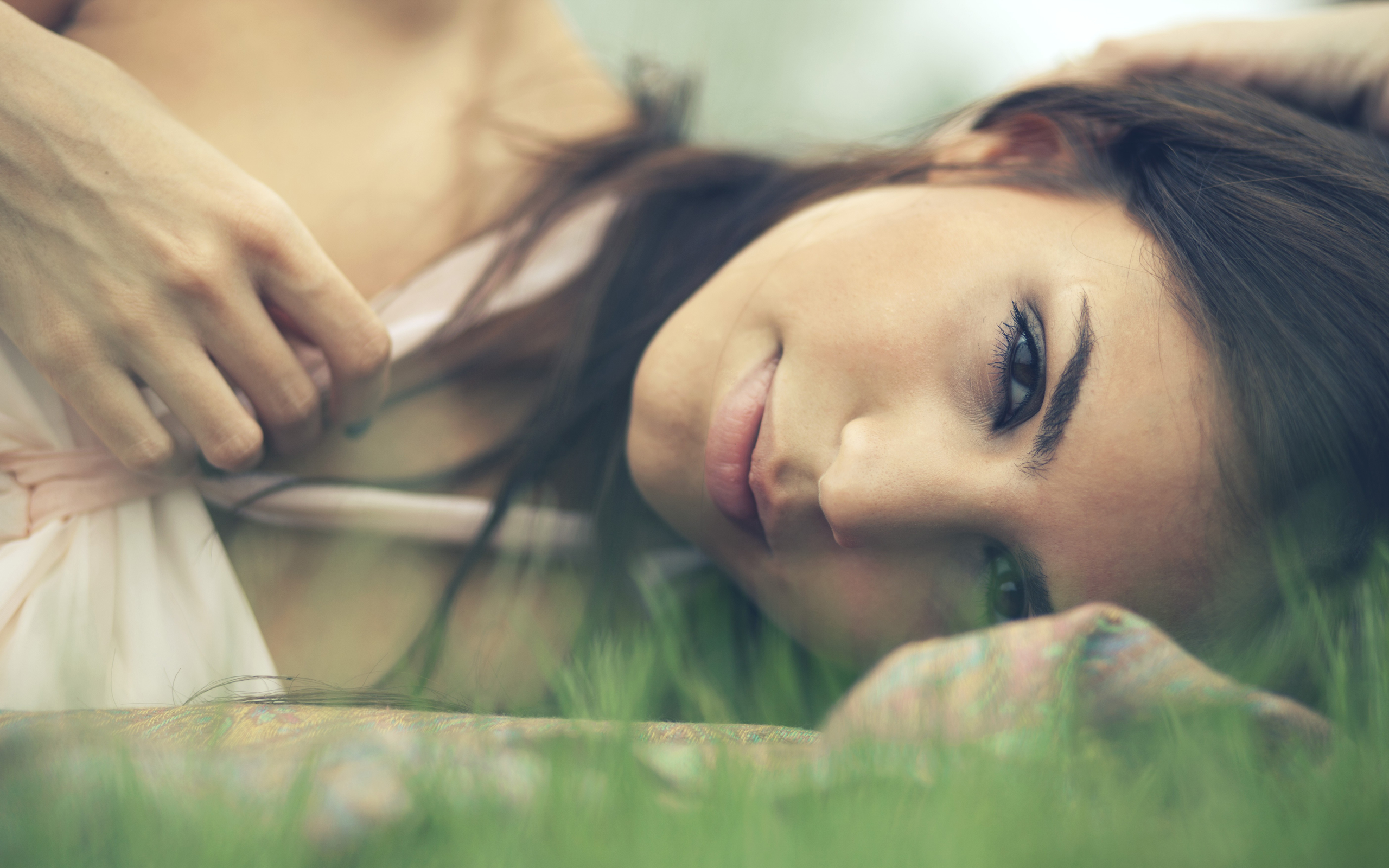 Description: A woman laying in the grass with her eyes closed and her hair in a ponytail.
