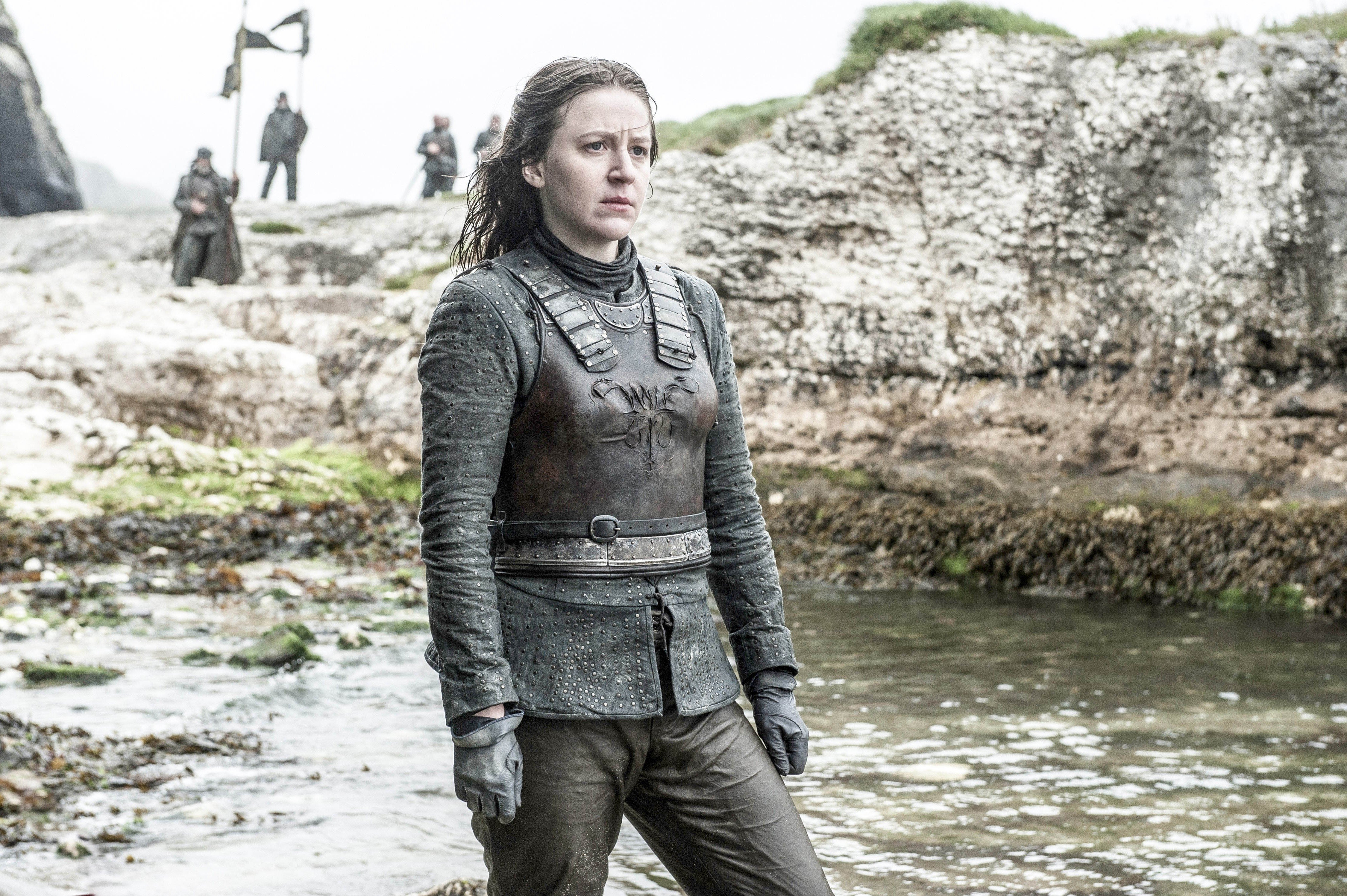 Description: A woman in a gray outfit standing on a rock near a river and a group of people in the background.