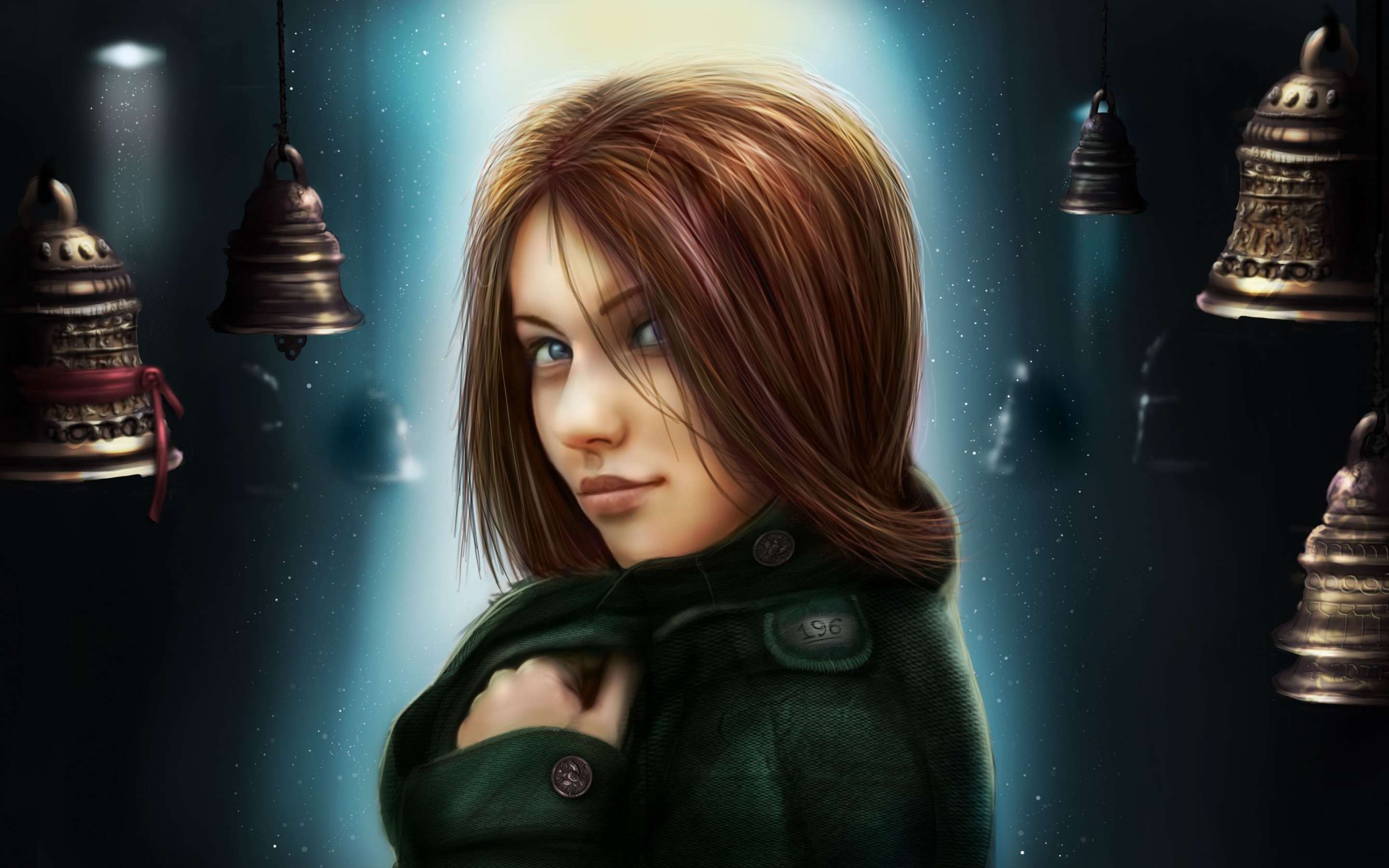 Description: A woman in a green coat is looking at the camera with a light shining on her head and a bunch of bells hanging from the ceiling.