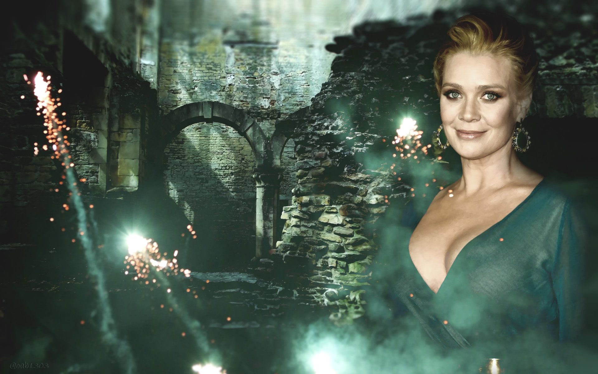 Description: A woman in a green dress standing in front of a castle with fireworks in the air and a bridge in the background.