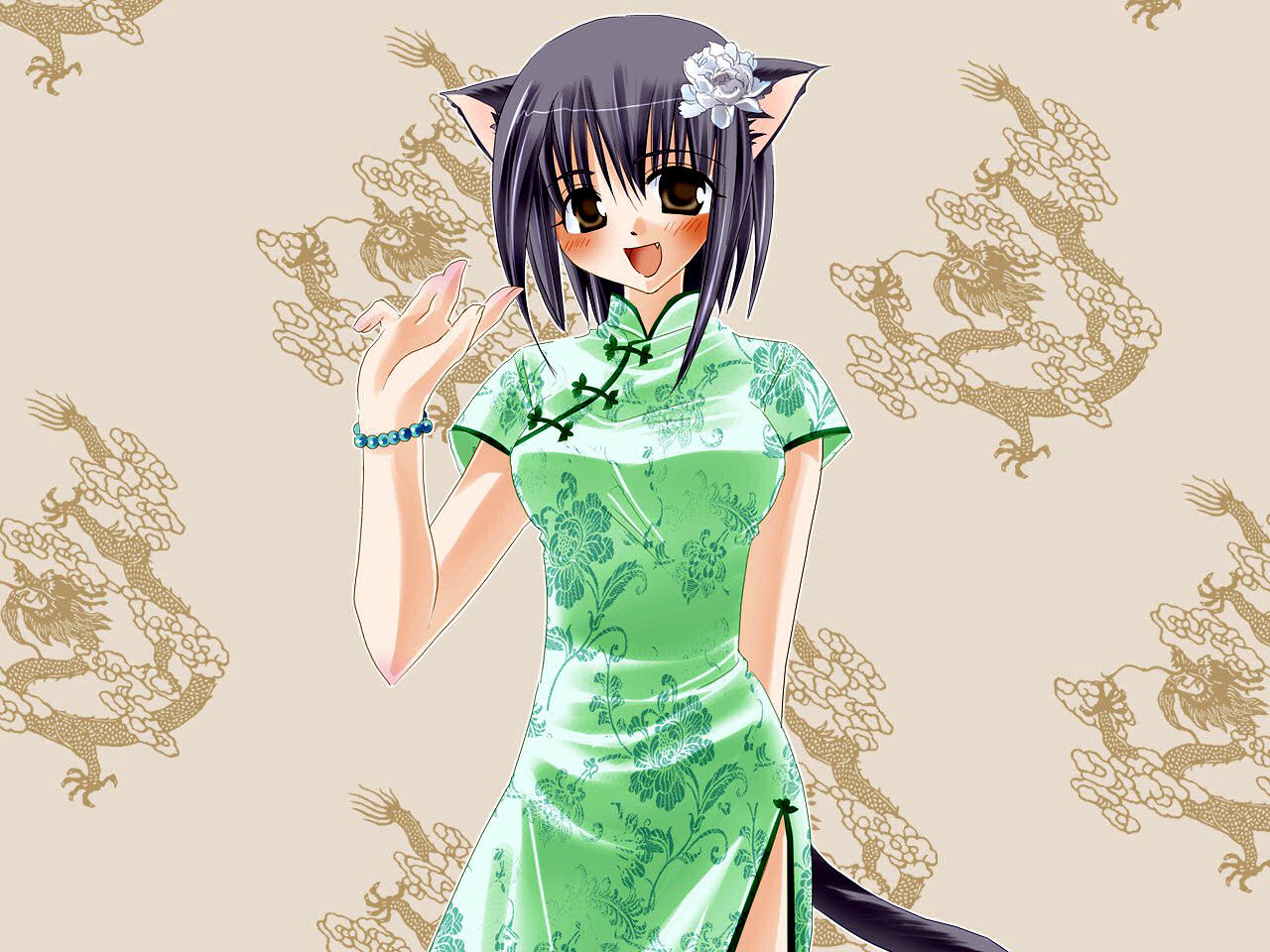 Description: A woman in a green dress with a cat on her head and a dragon on her shoulder.