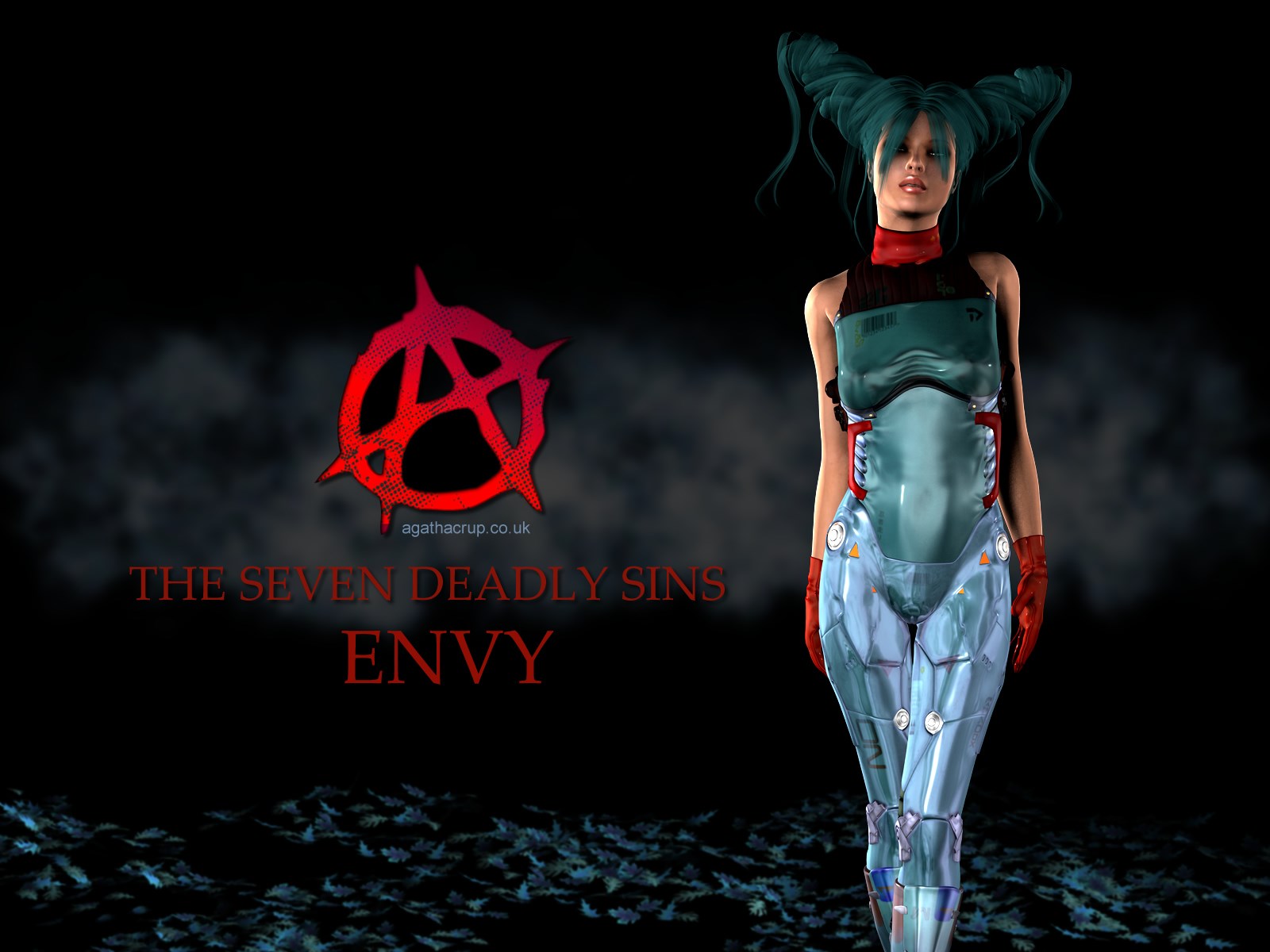 Description: A woman in a green dress with a demon head on her head and a red demon on her chest.