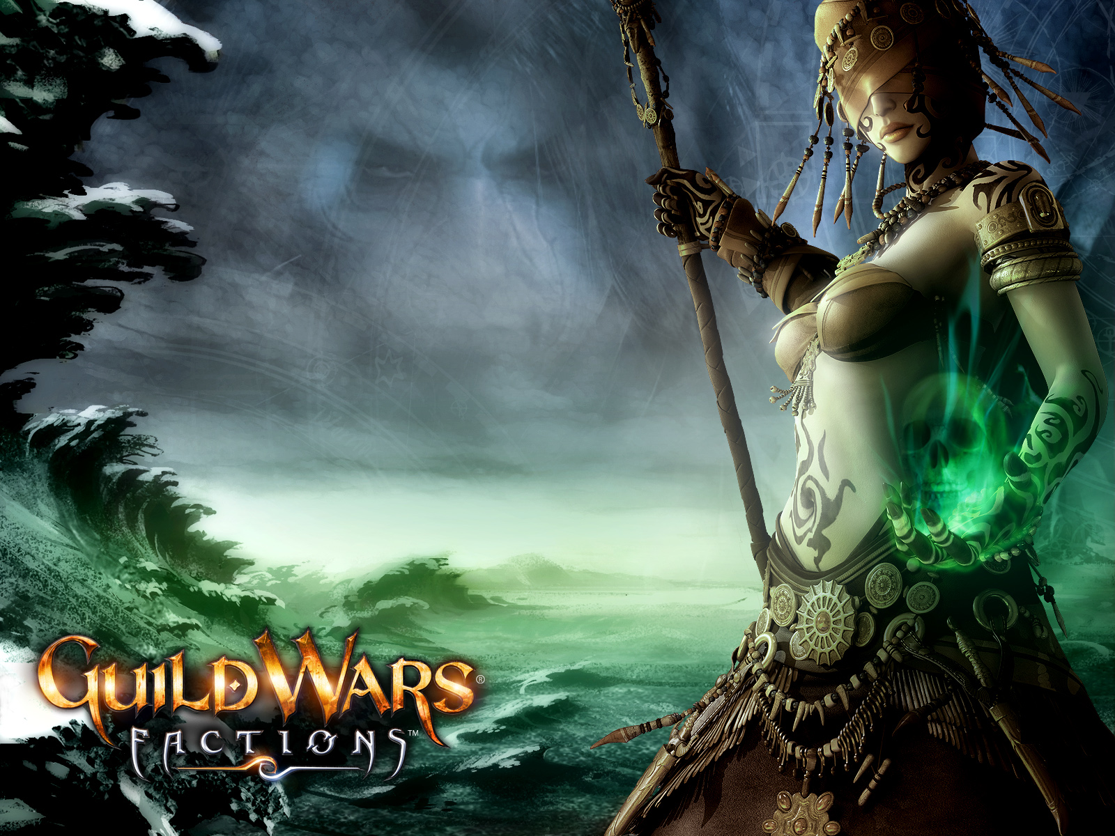 Description: A woman in a green dress holding a spear and a green ball in her hand.