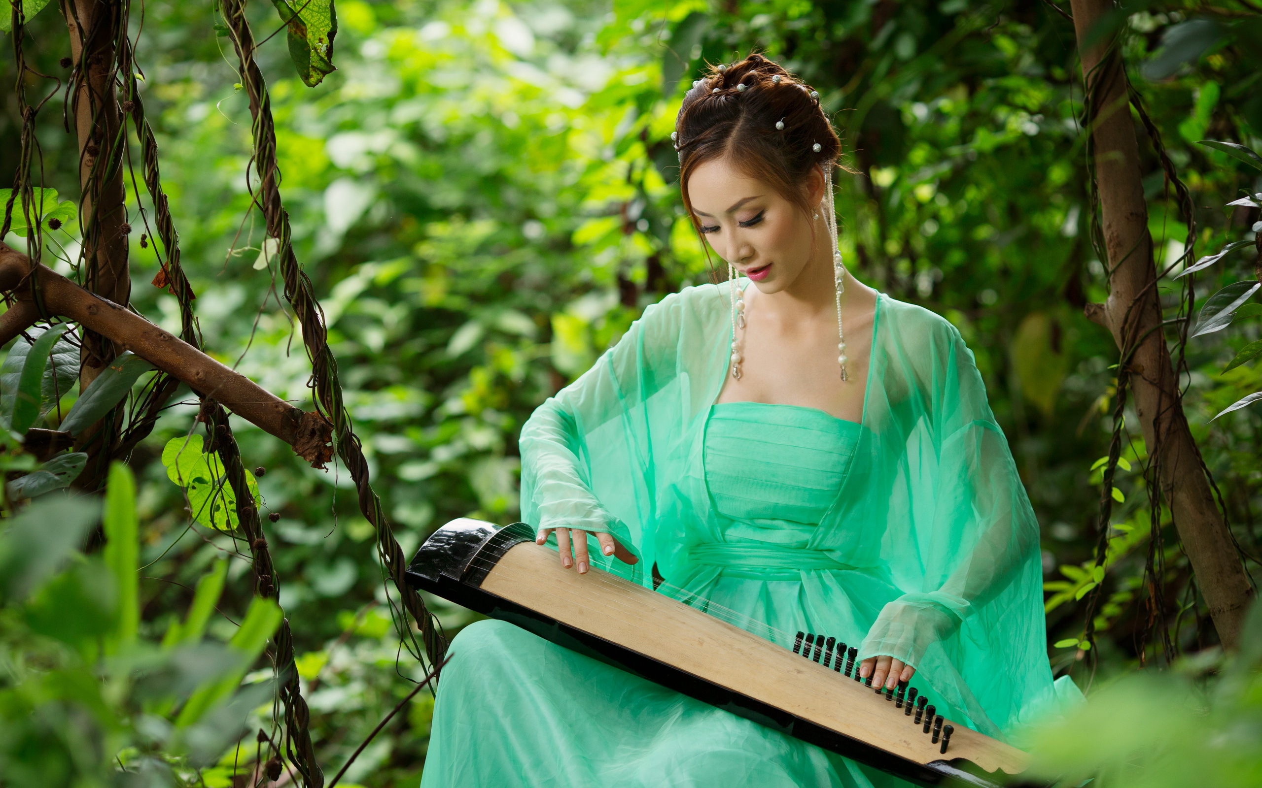 Description: A woman in a green dress playing a musical instrument in a forest setting with trees and foliage in the background.