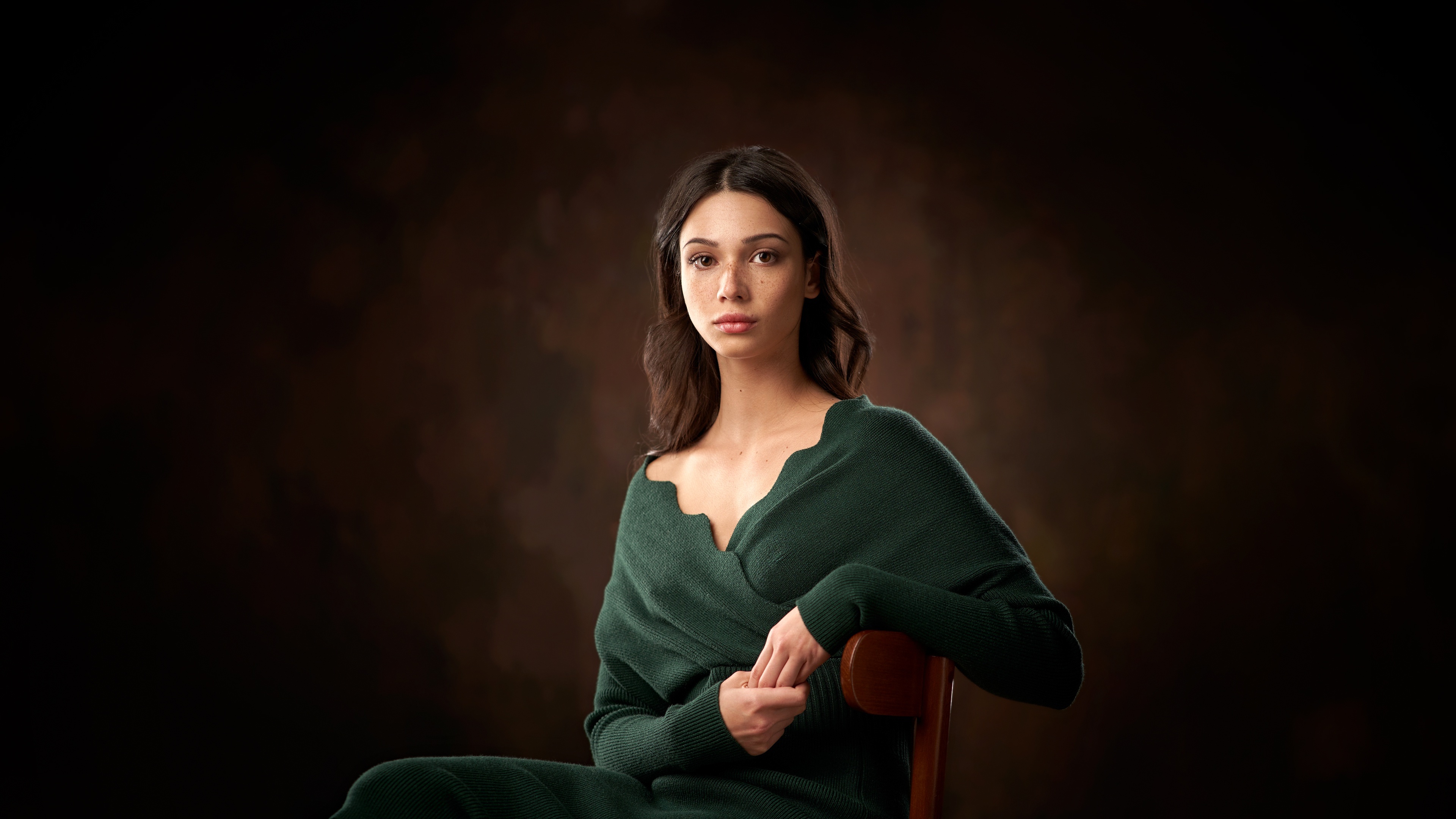 Description: A woman in a green dress sitting in a chair with her arms crossed and looking at the camera with a serious look on her face.