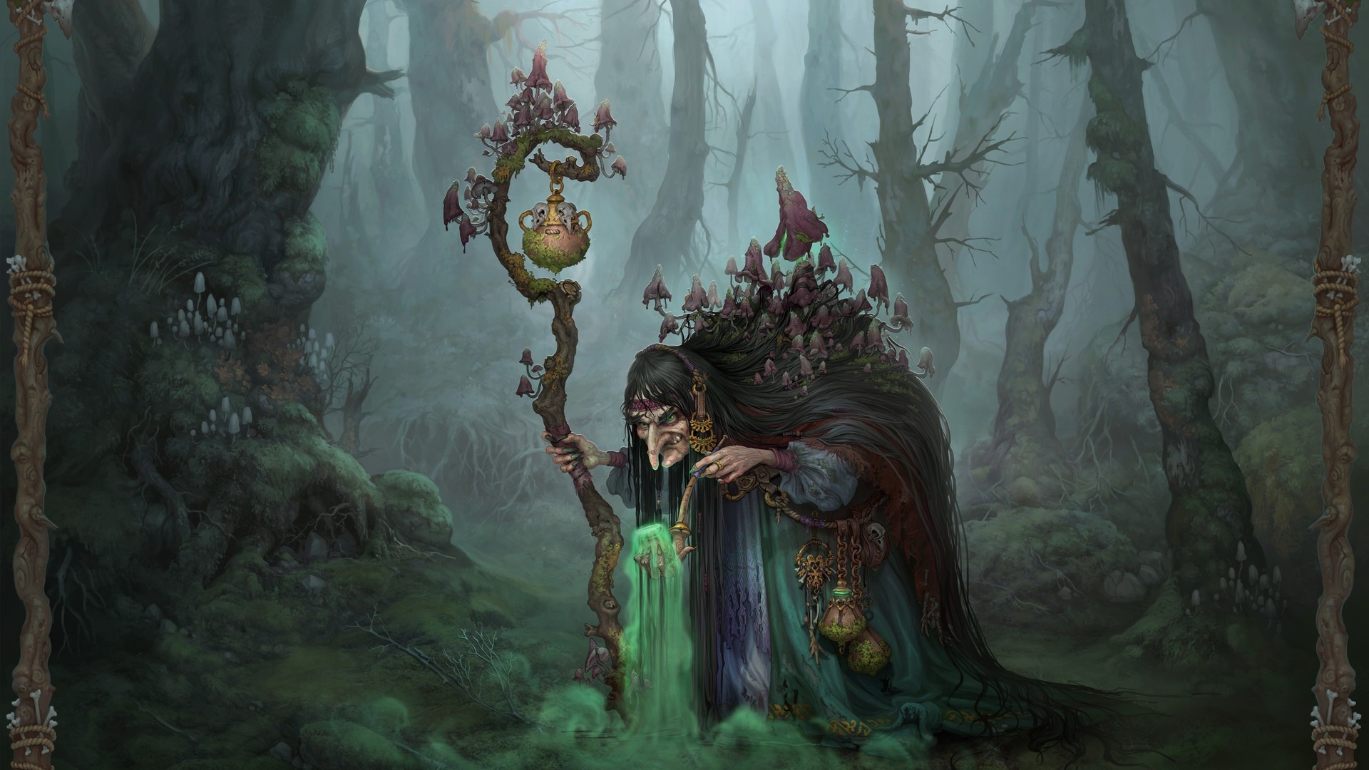 Description: A woman in a green dress holding a staff in a forest with trees and plants on it.