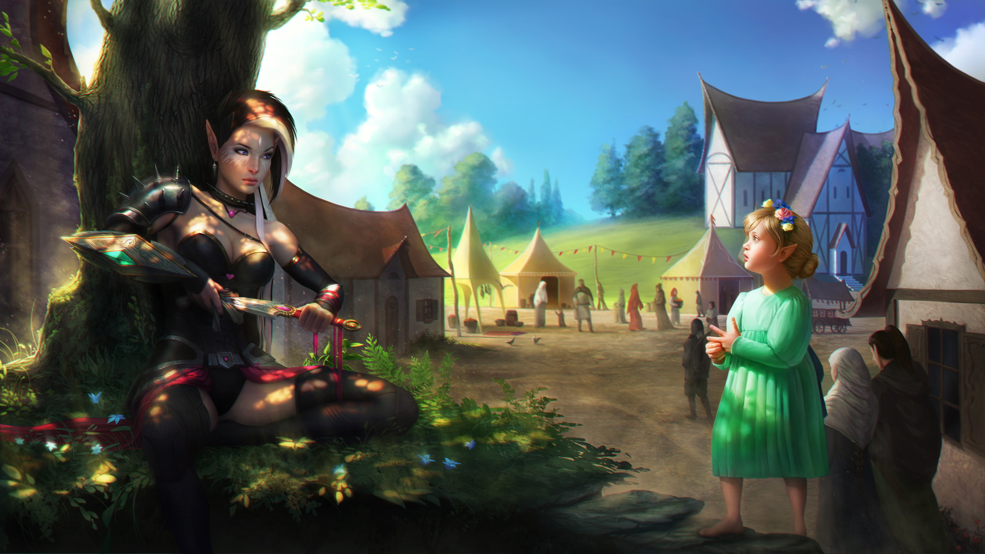 Description: A painting of a woman in a green dress standing next to a tree and a man in a suit.