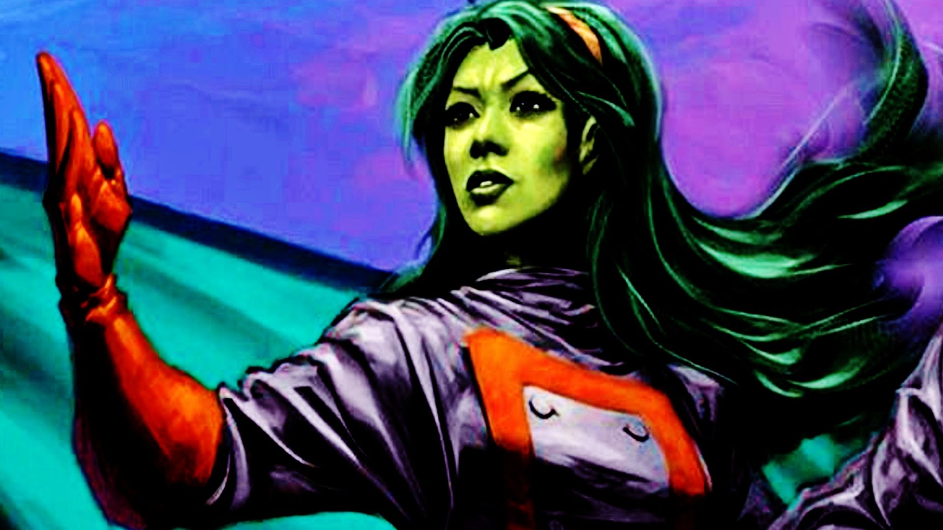 Description: A painting of a woman with green hair and a red shirt on holding a cell phone in her hand.