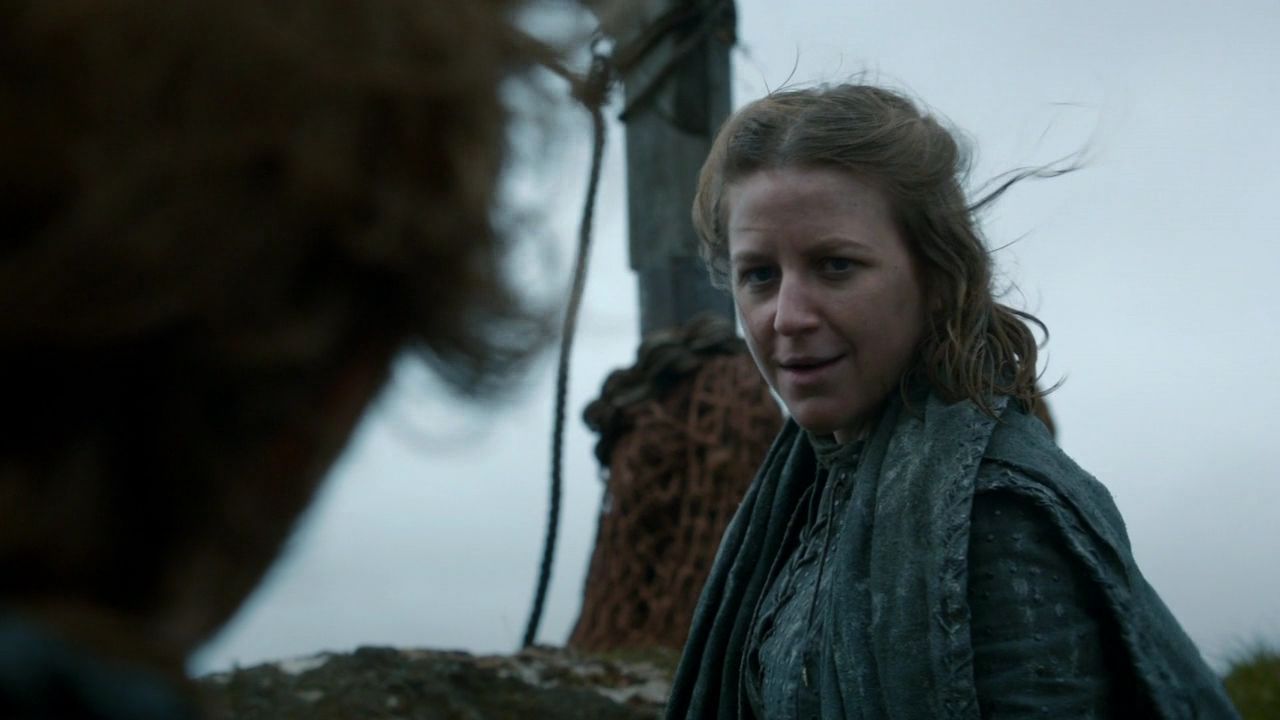 Description: A woman in a green jacket standing next to a statue of a person on a hill with a cross in the background.