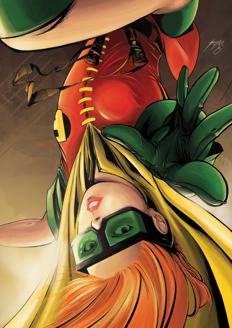 Description: A woman with a green mask and a red shirt on her head and a green mask on her head.