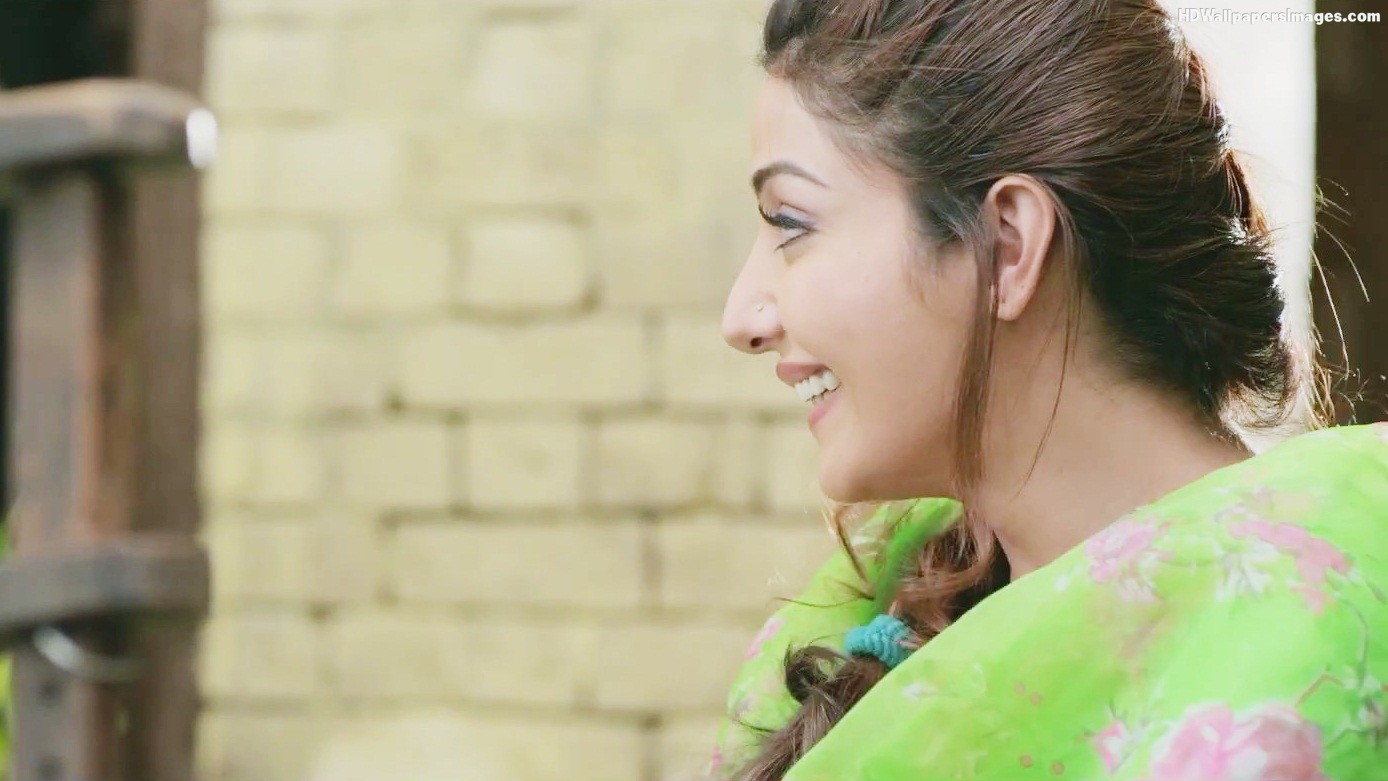 Description: A woman with a green and pink sari and a brick wall behind her smiling at something in the distance.