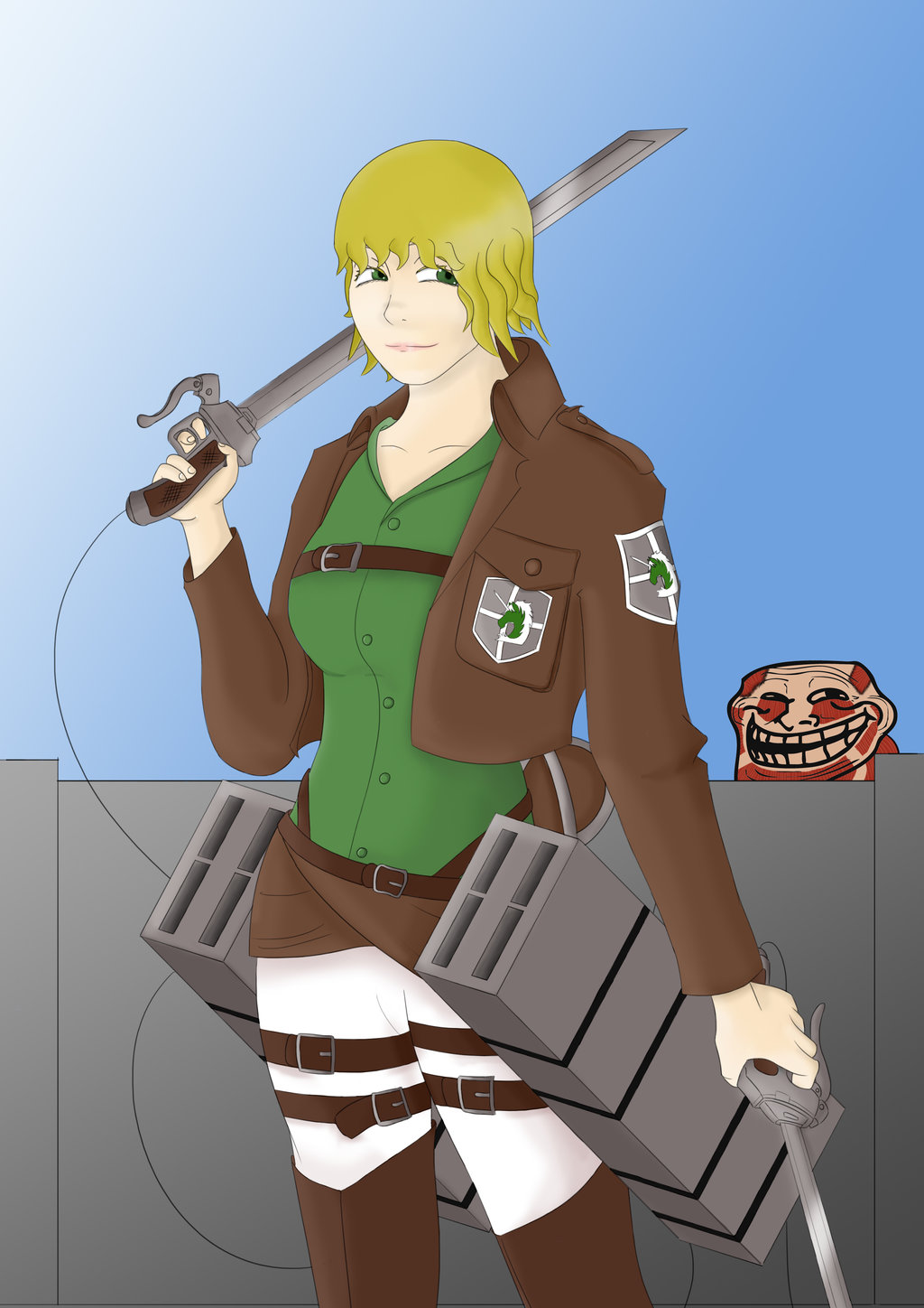 Description: A woman in a green shirt holding a sword and a box of boxes with a skull on it and a skull on the wall behind her.