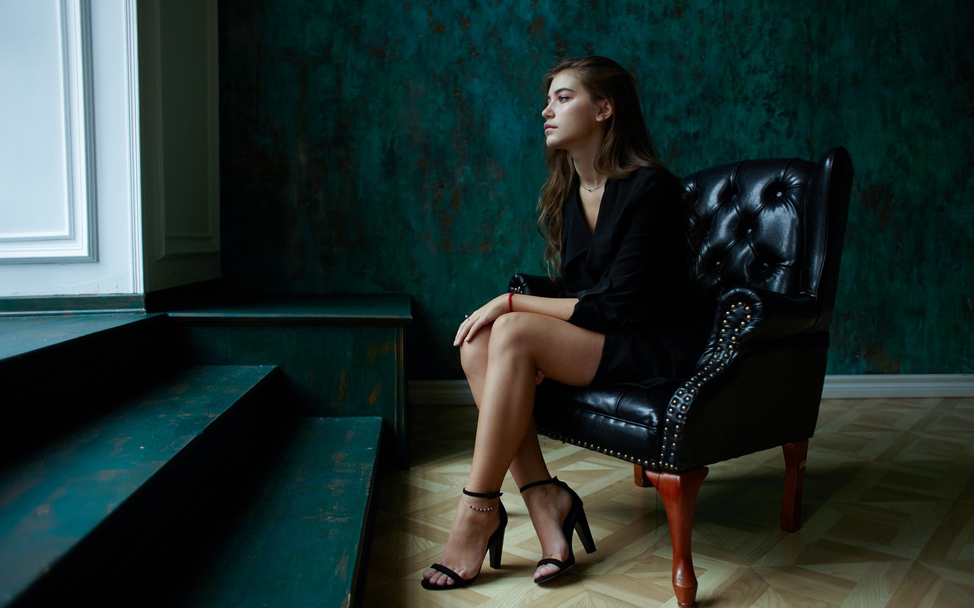 Description: A woman sitting on a chair in a room with a green wall and stairs in the background.