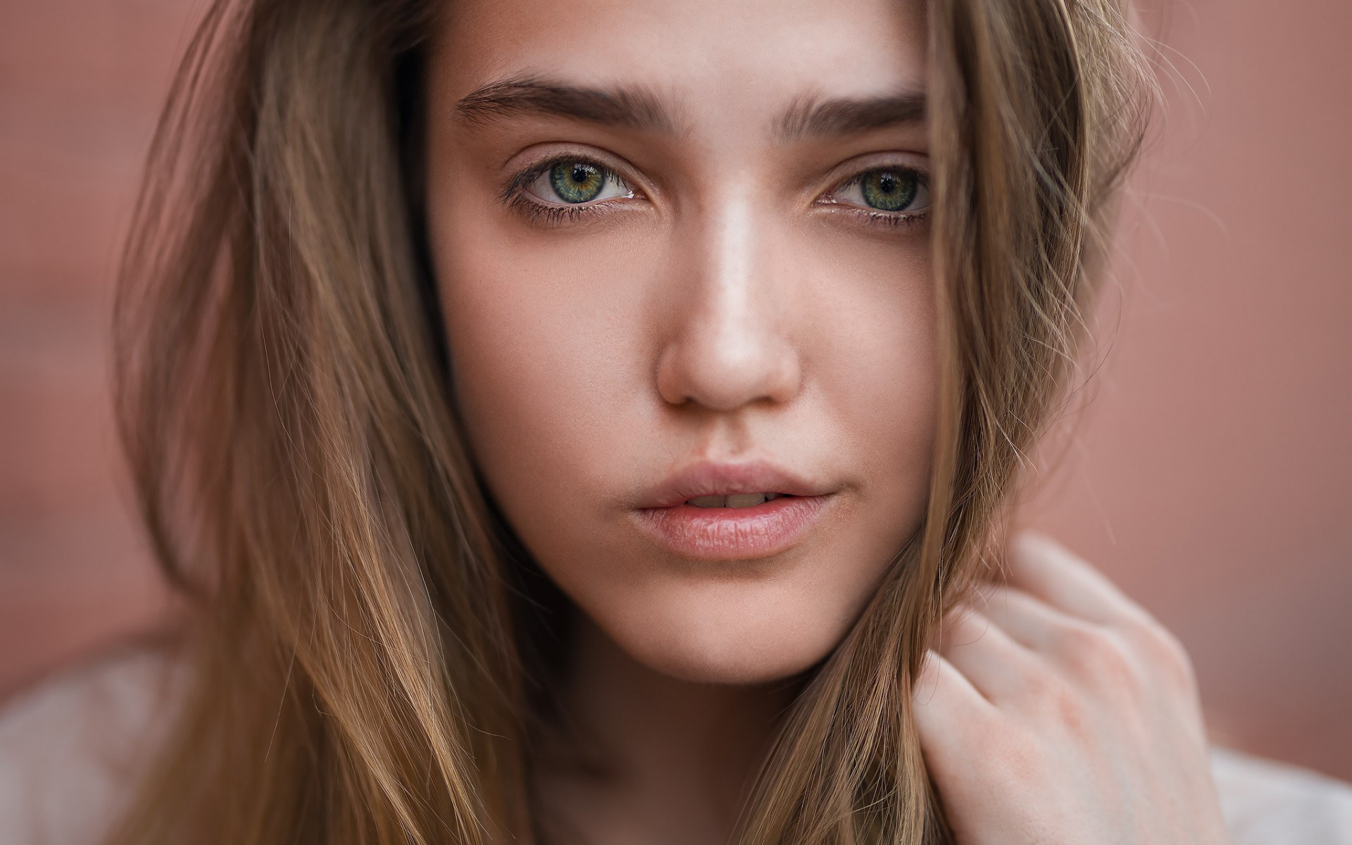 Description: A woman with long hair and green eyes posing for a picture with her hand on her shoulder and her hand on her shoulder.