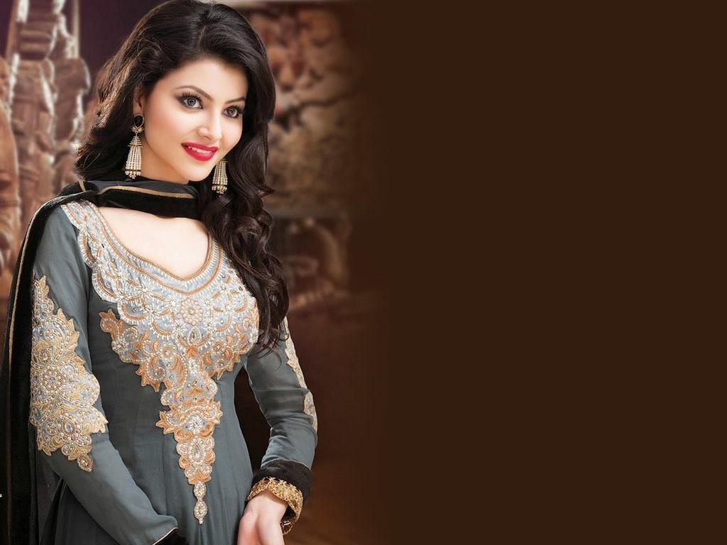 Description: A woman in a grey dress posing for a picture with a brown background and a brown wall behind her.