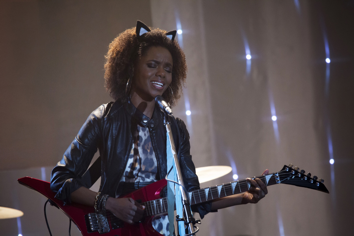 Description: A woman with a guitar and a microphone in her hand and a cat ears on her head and a black leather jacket.