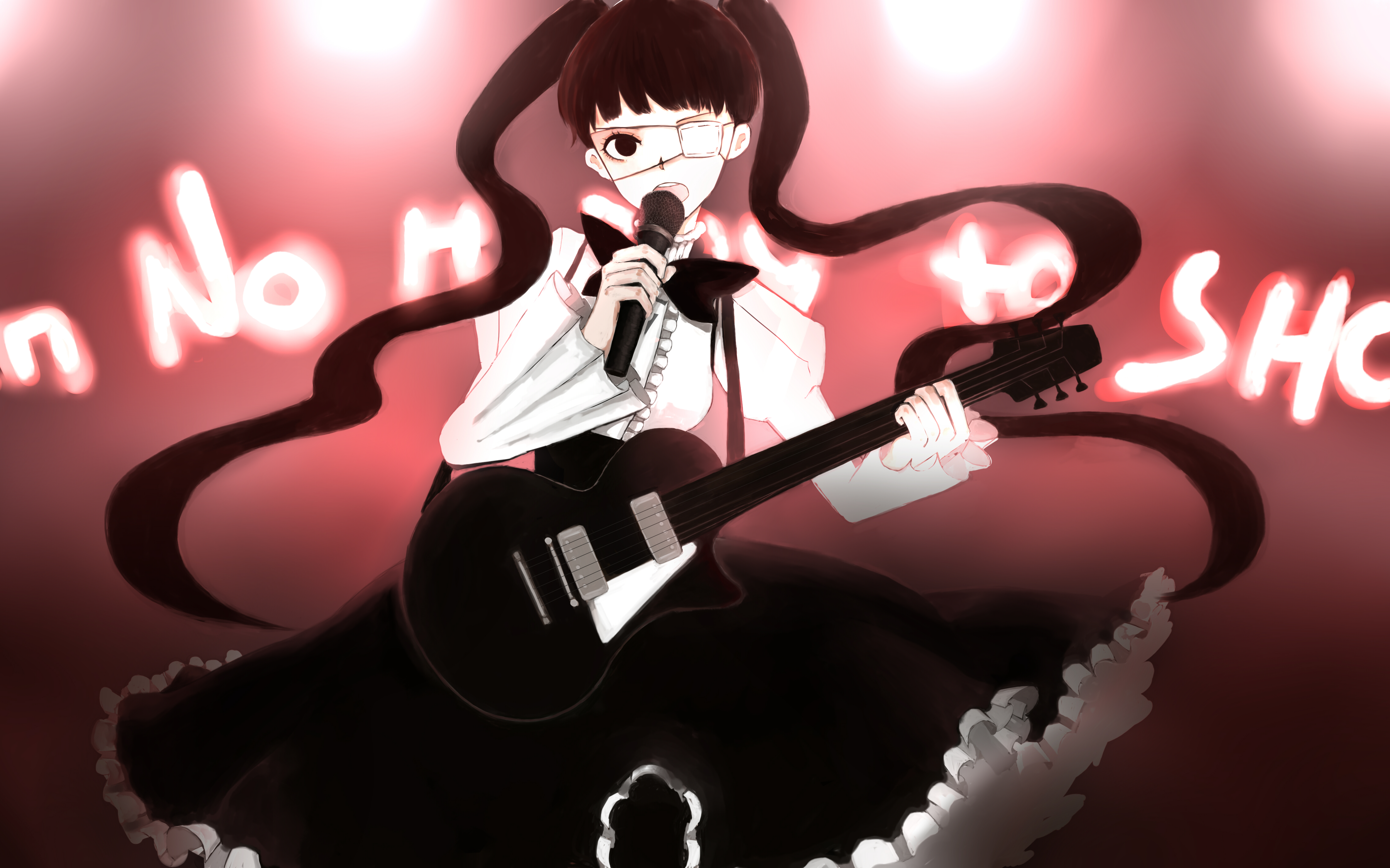 Description: A woman with a guitar and a microphone in front of a sign that says.