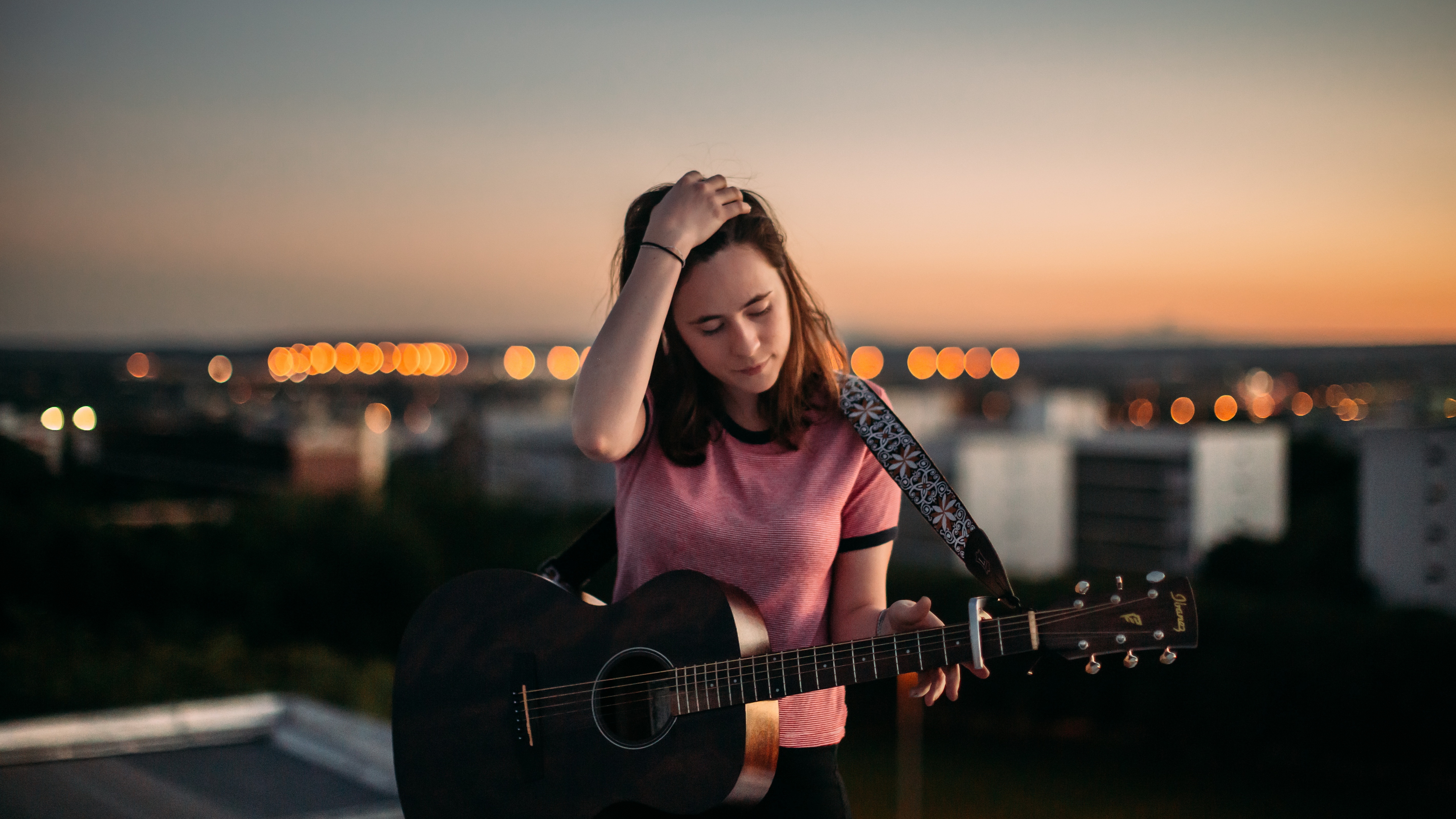 Description: A woman holding a guitar while standing on a roof top at sunset with a city in the background at twilight.
