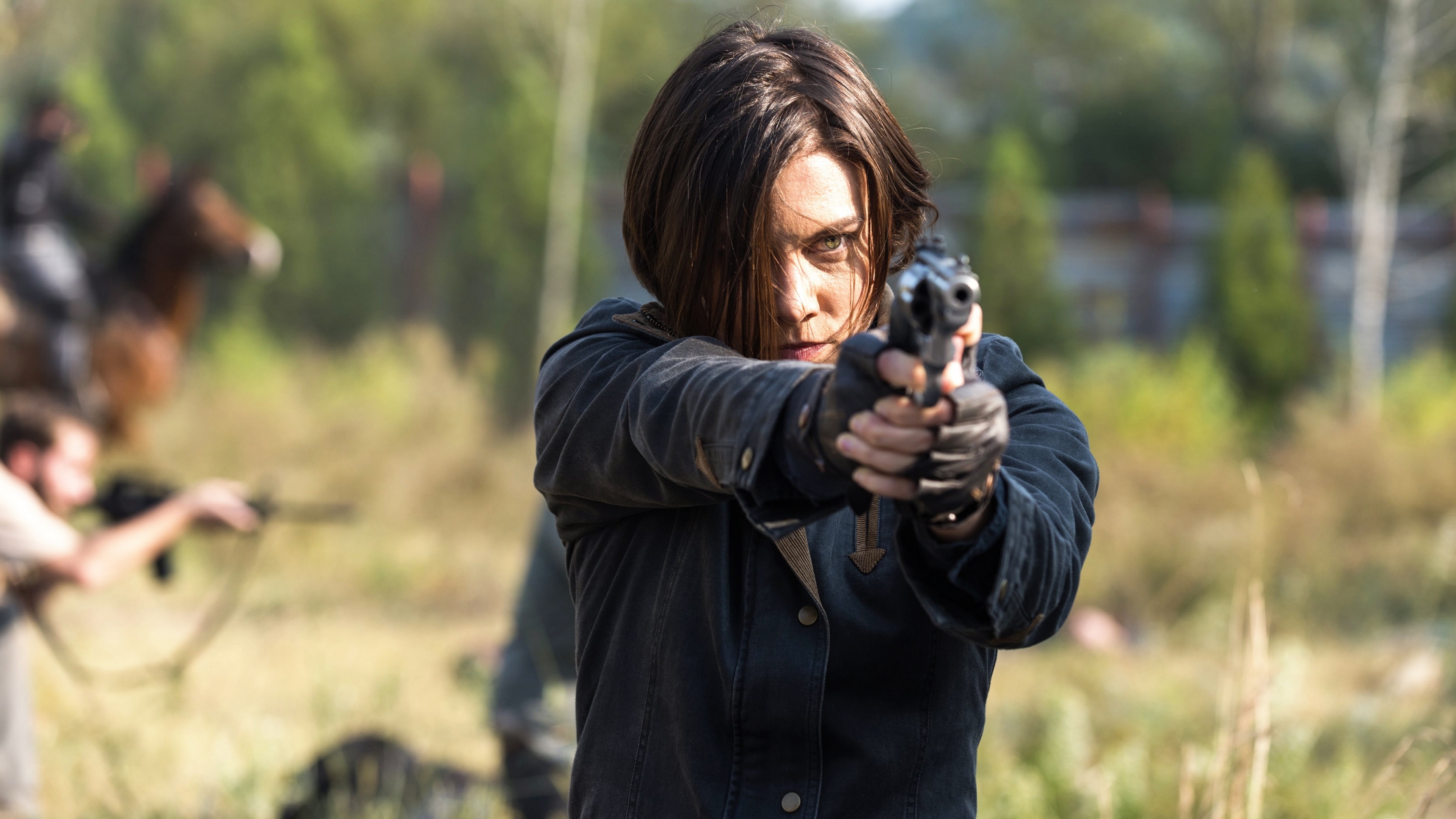Description: A woman holding a gun in a field with other people in the background holding guns in their hands and aiming at something.