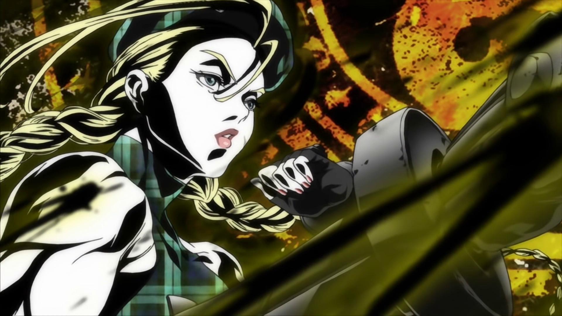 Description: A woman with a gun in her hand and a fire in the background with a black and white background.