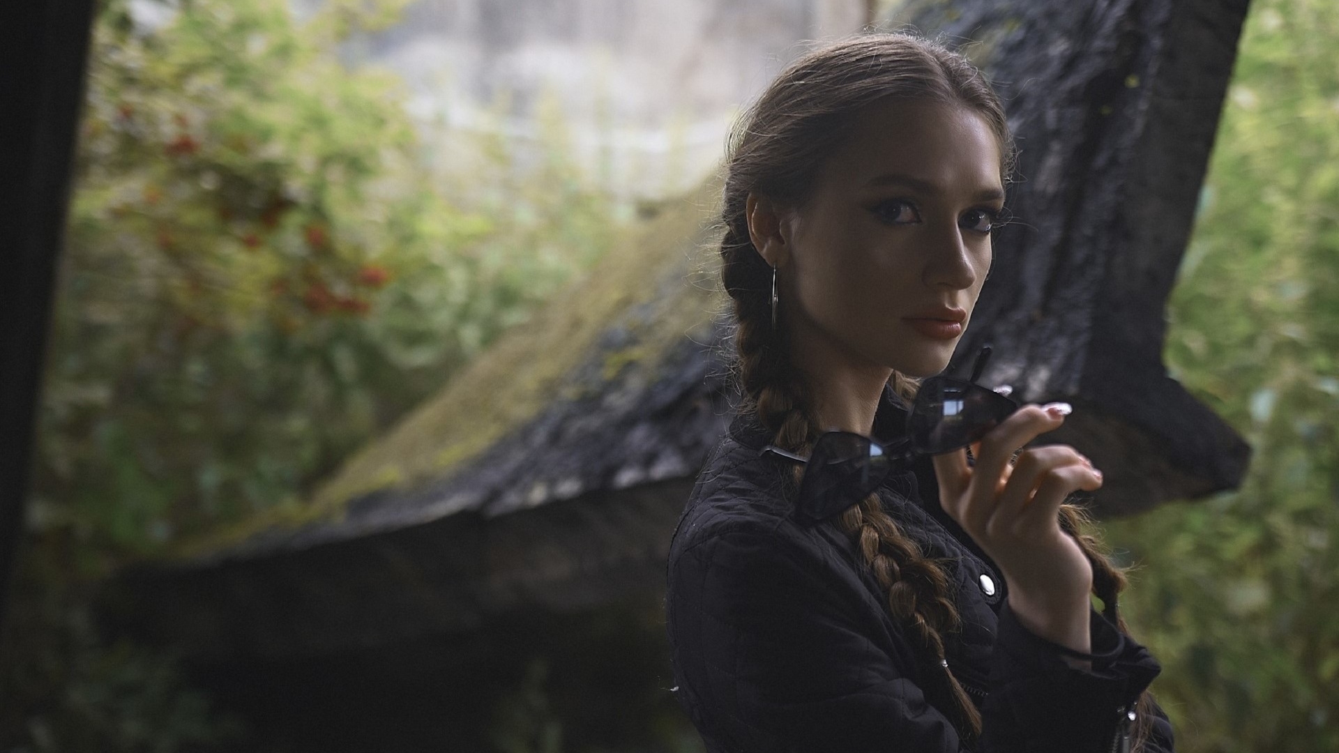 Description: A woman holding a gun in her right hand and looking at the camera with a forest in the background.