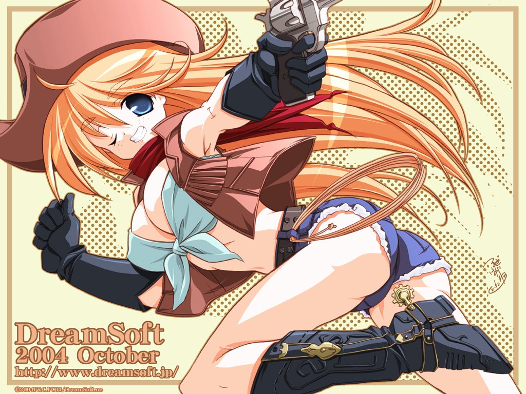 Description: A woman with a gun and a hat on her head and a dress on her body and a hat on her head.