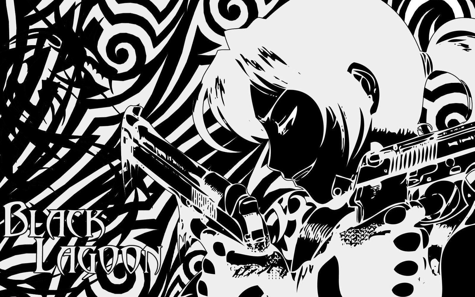 Description: A black and white drawing of a woman with a gun in her hand and a background of swirls.