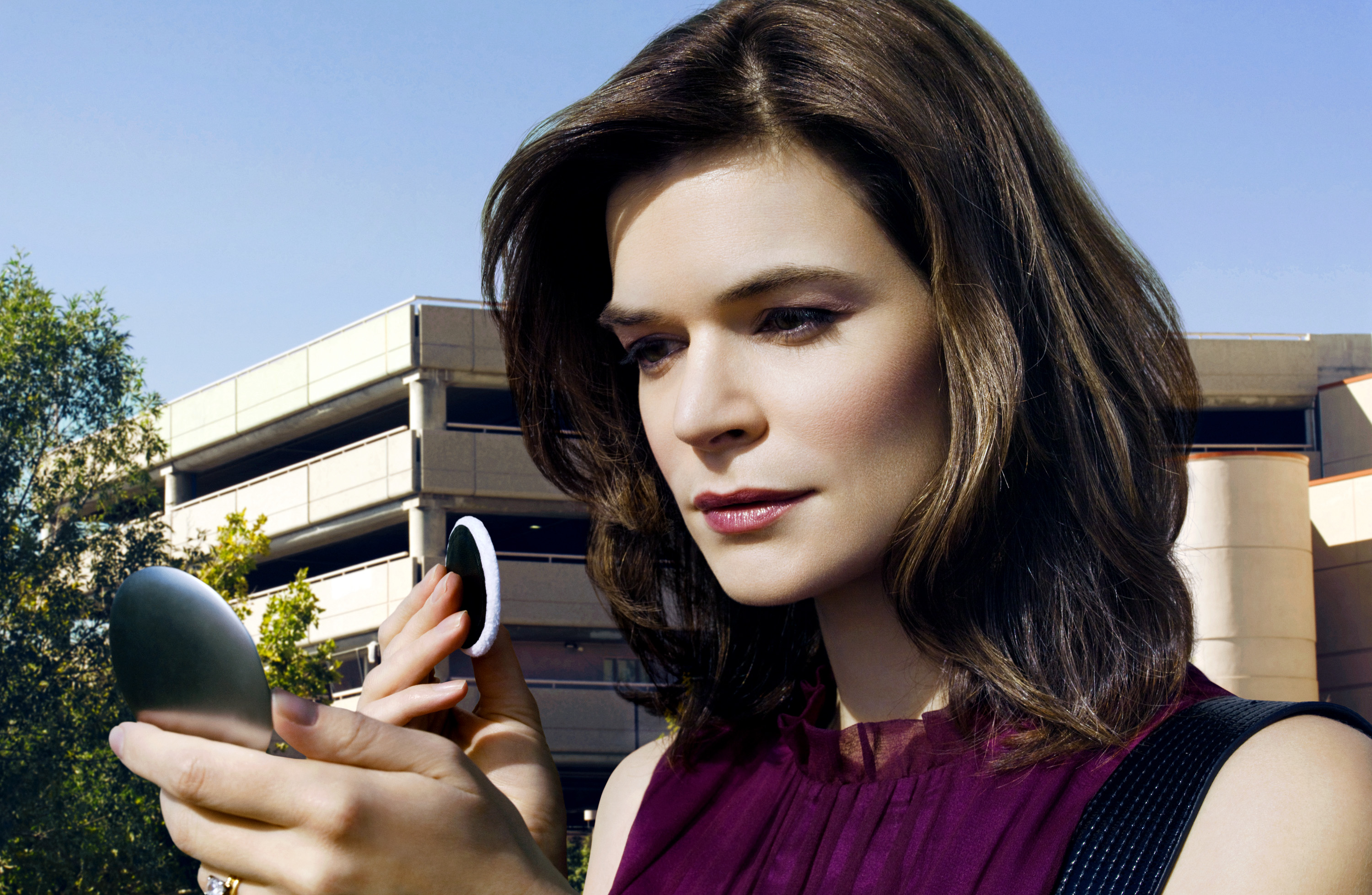 Description: A woman holding a hair dryer and a mirror in her hand outside a building with a tree in the background.