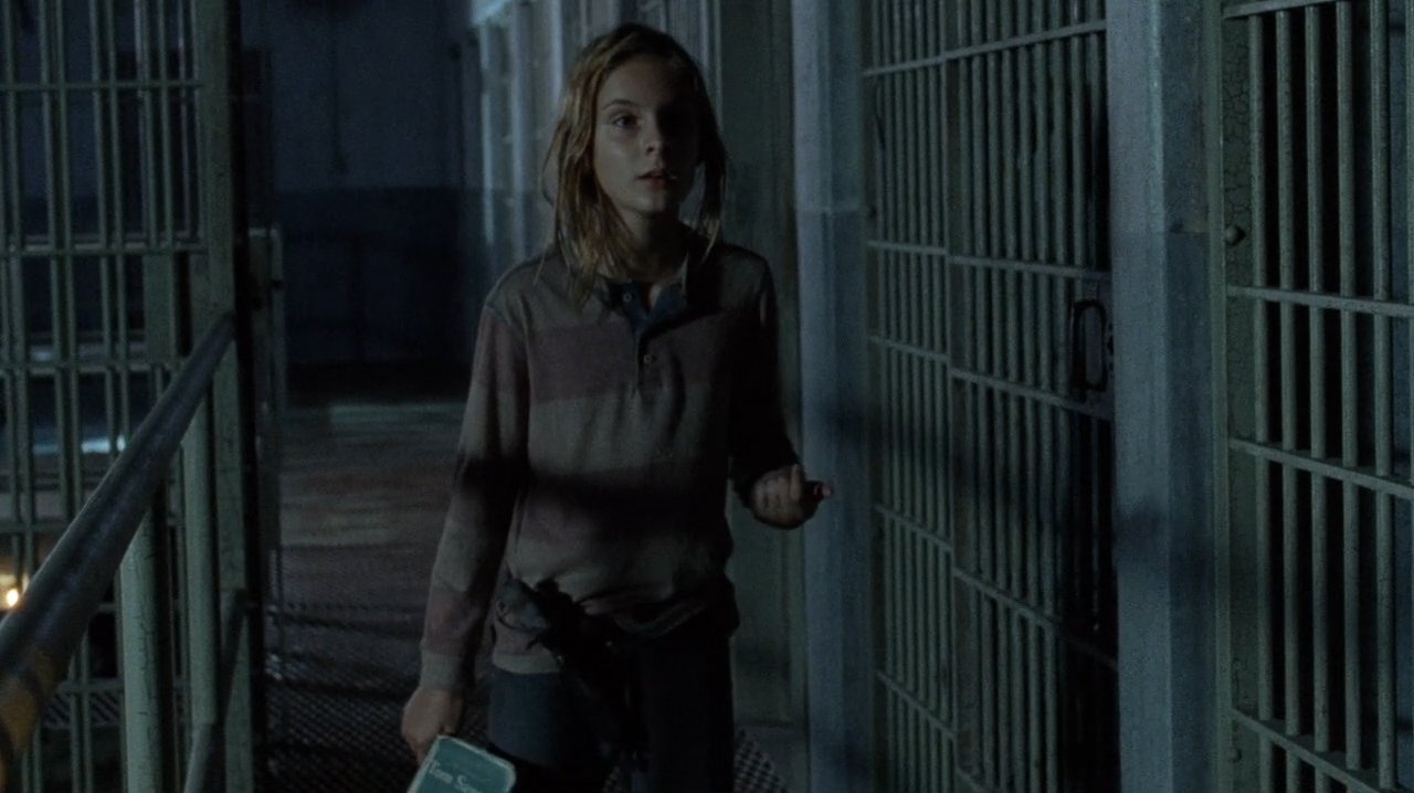 Description: A woman walking down a hallway next to a jail cell door with a lit candle in her hand and a book in her other hand.