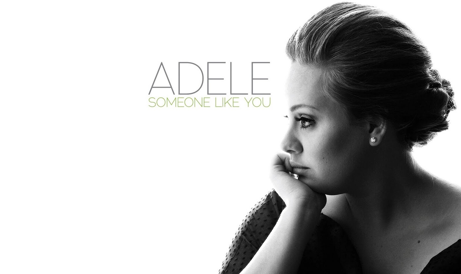 Description: A woman with her hand on her chin looking away from the camera with a white background and the words adelle on it.