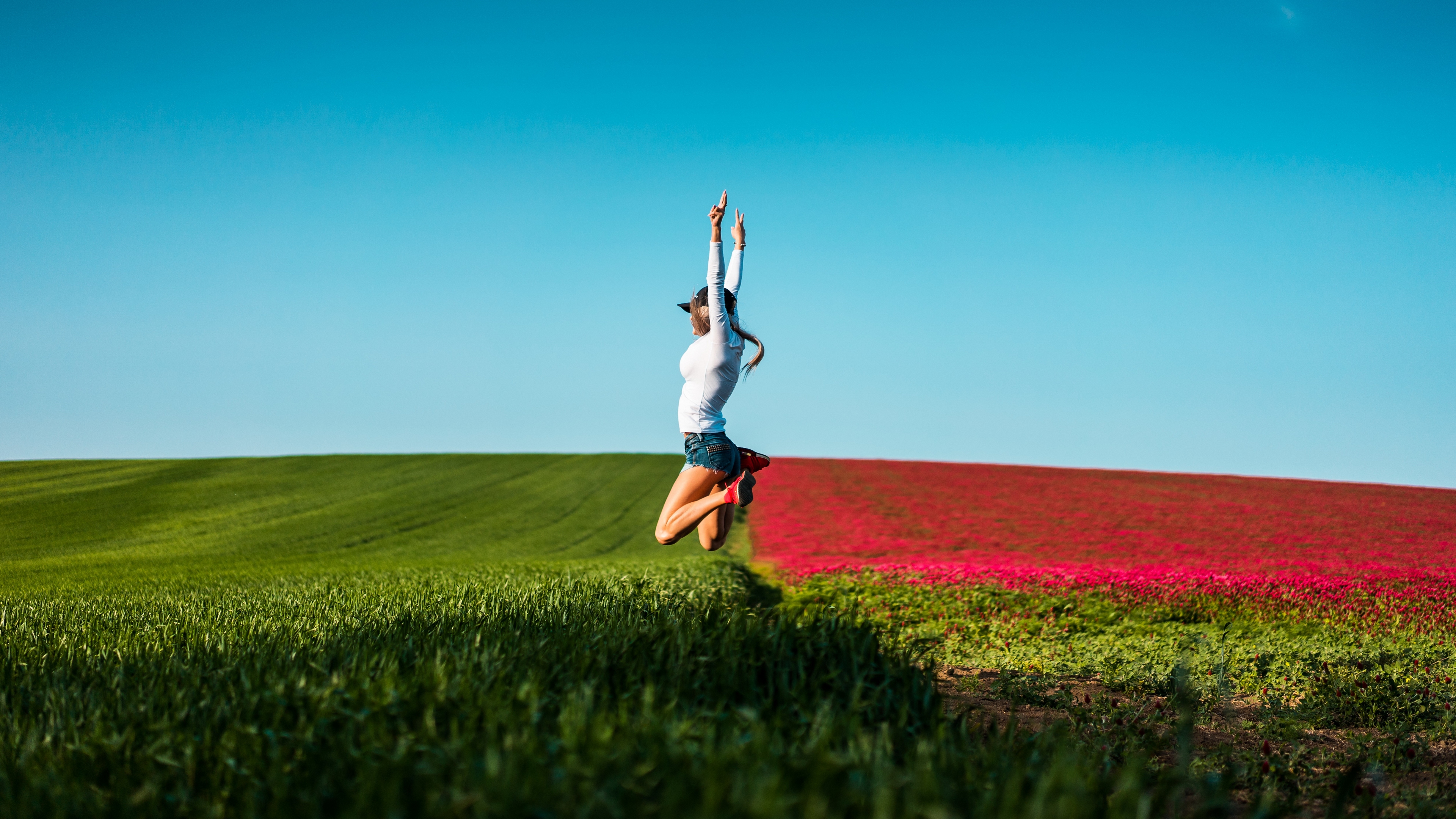 Description: A woman is doing a handstand in a field of flowers and grass with her hands in the air.