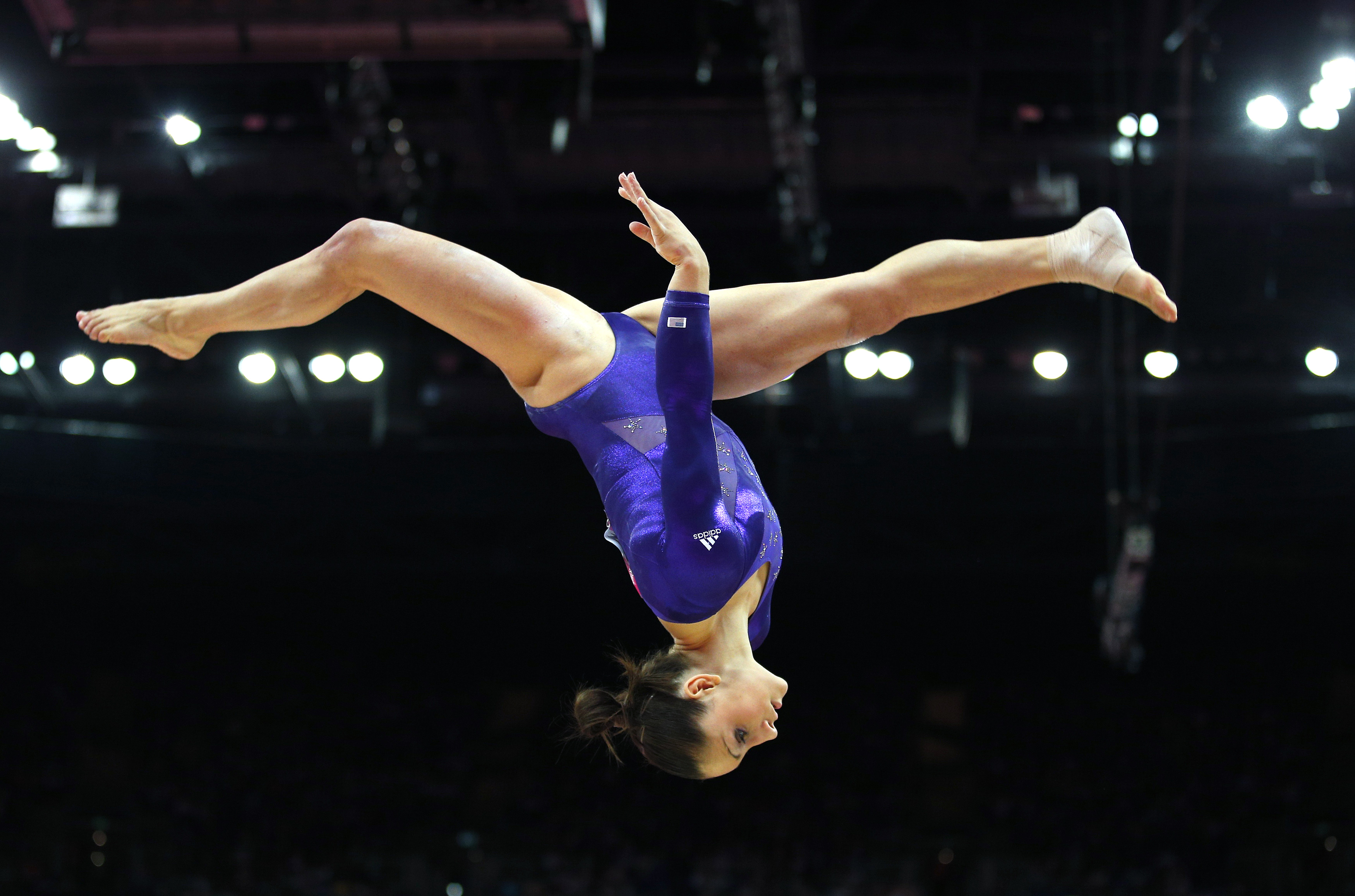 Description: A woman doing a handstand on a gymnastics floor in a gym with lights on the ceiling and a crowd watching.