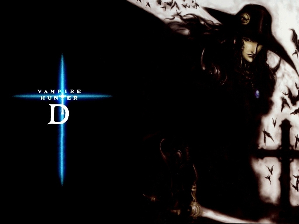 Description: A woman with a hat and a long black coat standing in front of a cross and bats on a wall.