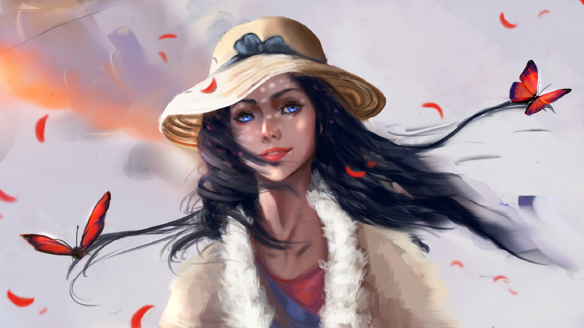Description: A woman with a hat and a butterfly on her shoulder and a white jacket on her shoulders and a white jacket on her shoulders.