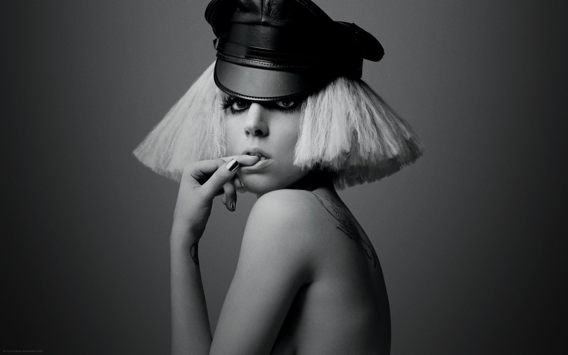 Description: A woman with a hat and a cigarette in her mouth and a cigarette in her mouth.