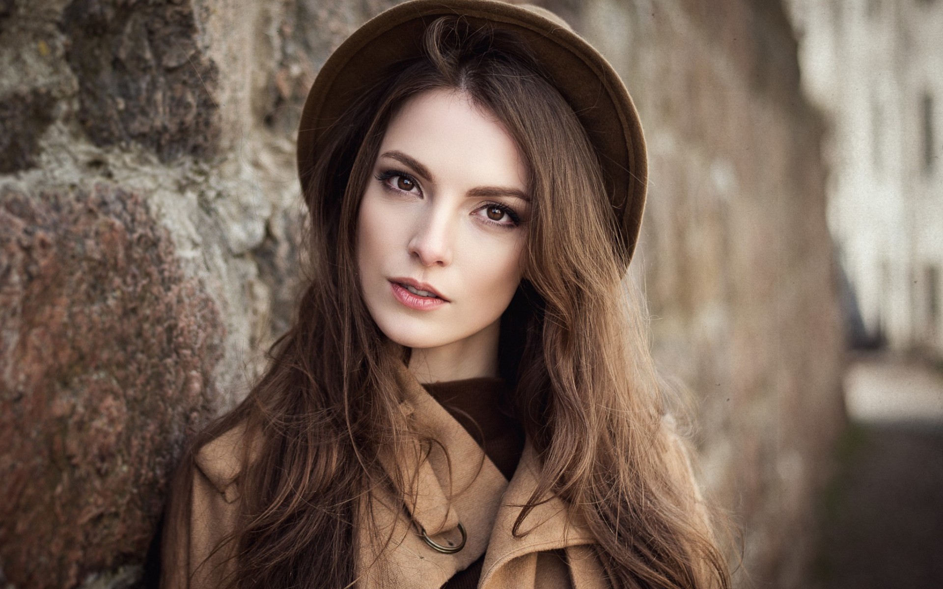 Description: A woman with long hair wearing a hat and coat standing in front of a stone wall with a stone wall behind her.