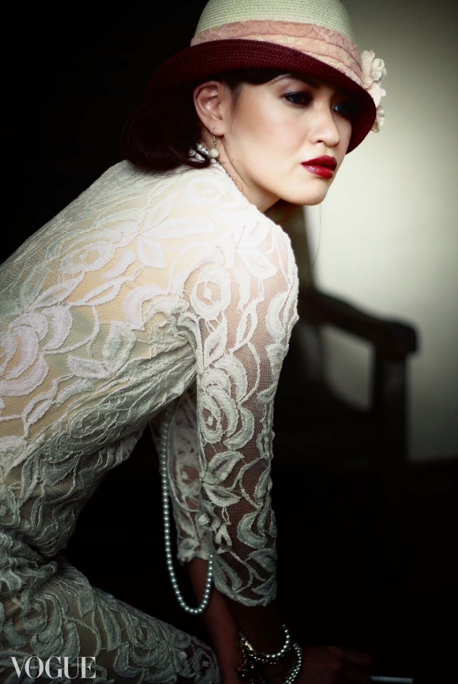 Description: A woman in a hat and dress posing for a picture in a dark room with a chair and a light.