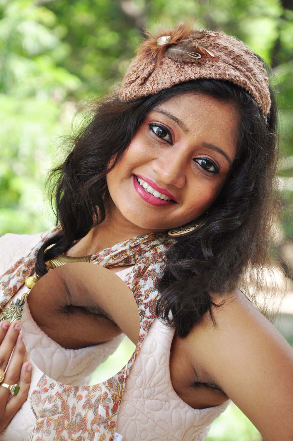 Description: A woman with a hat and a dress smiling for the camera with her hands on her hips and her arm around her neck.