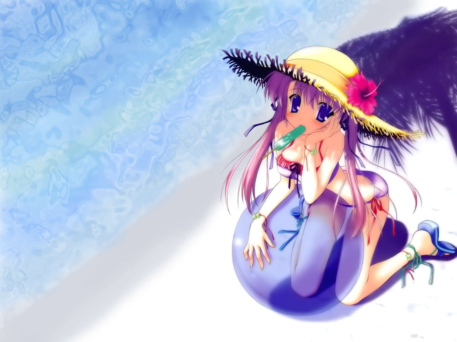 Description: A woman with a hat and a feather on her head sitting on a ball with a bird on her head.