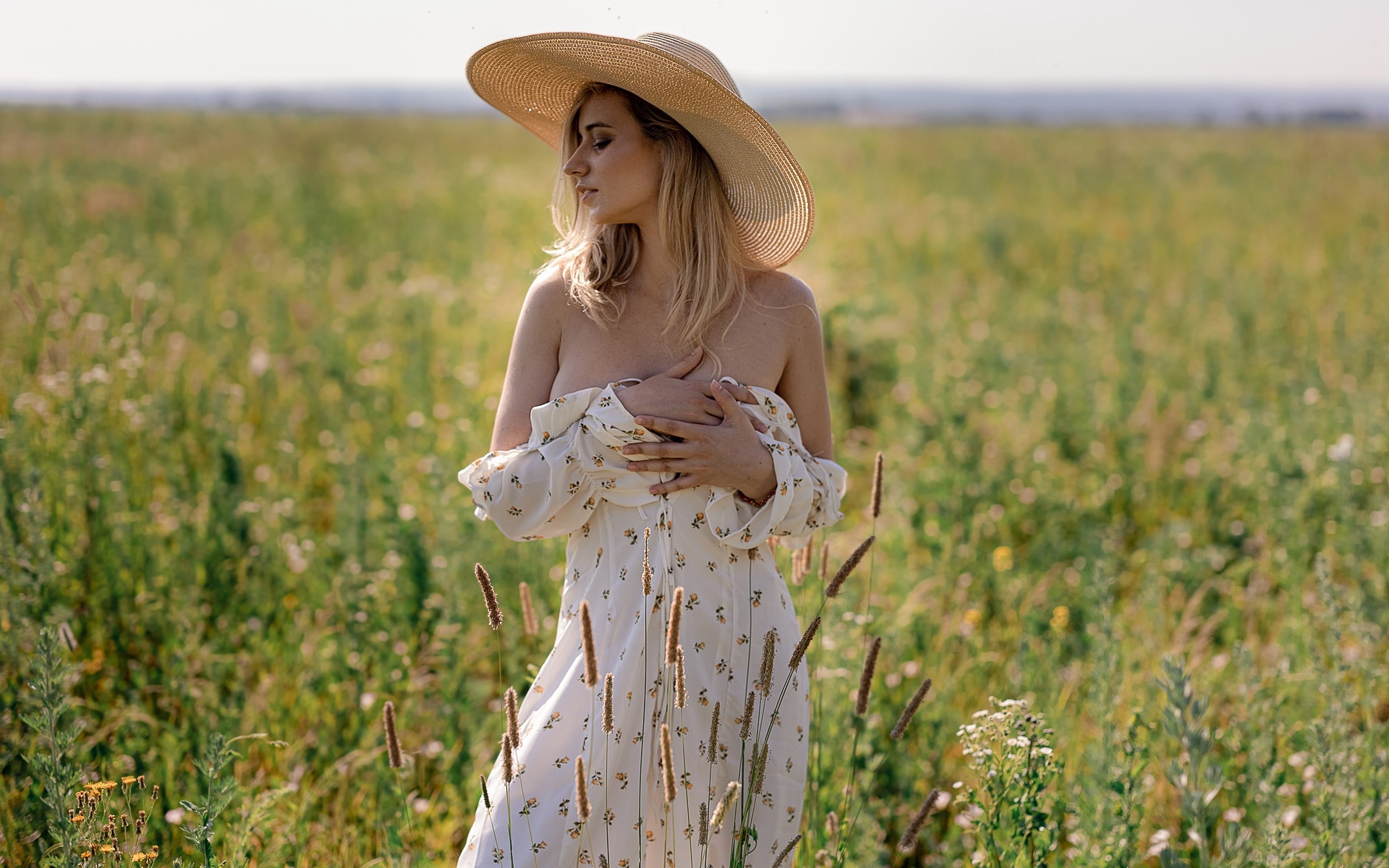 Description: A woman in a hat standing in a field of tall grass with her arms folded up and her hands folded.