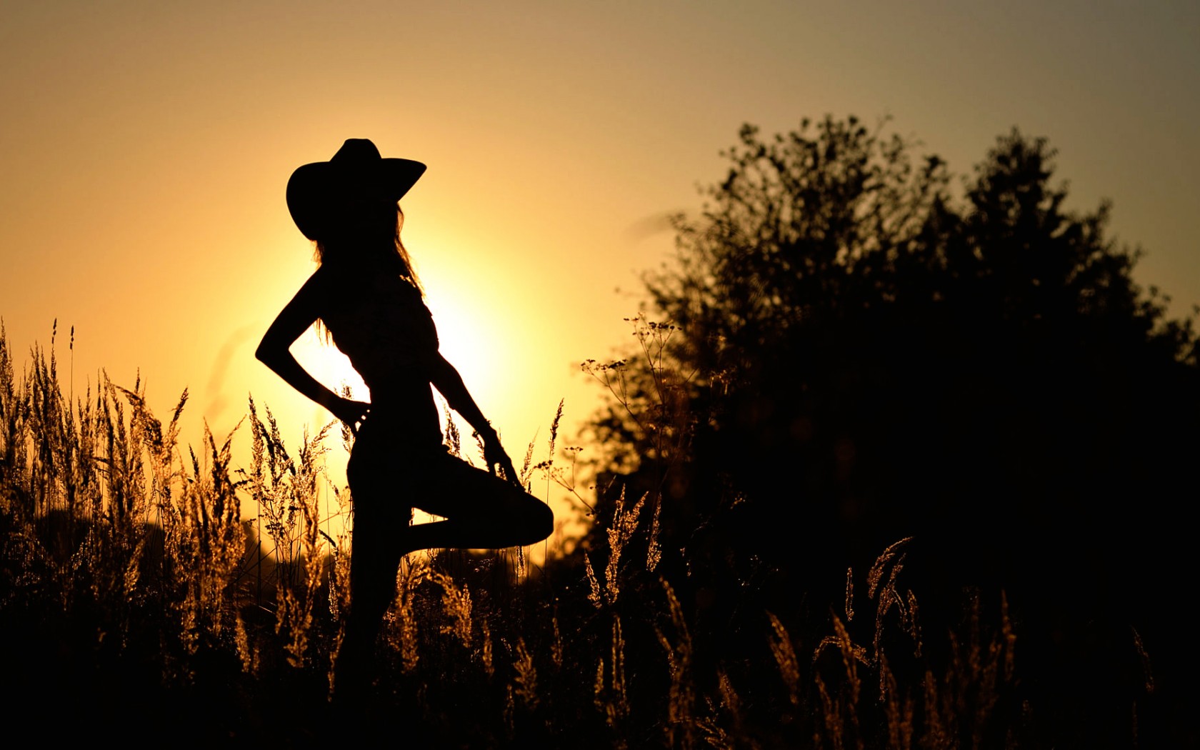 Description: A woman in a hat is standing in a field at sunset with her hands on her hips and her legs crossed.