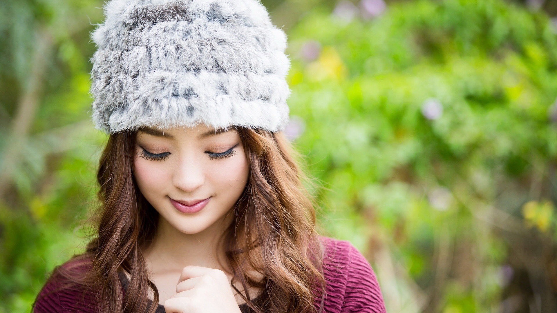 Description: A woman wearing a hat with a fur pom pom on top of it's head and looking down.