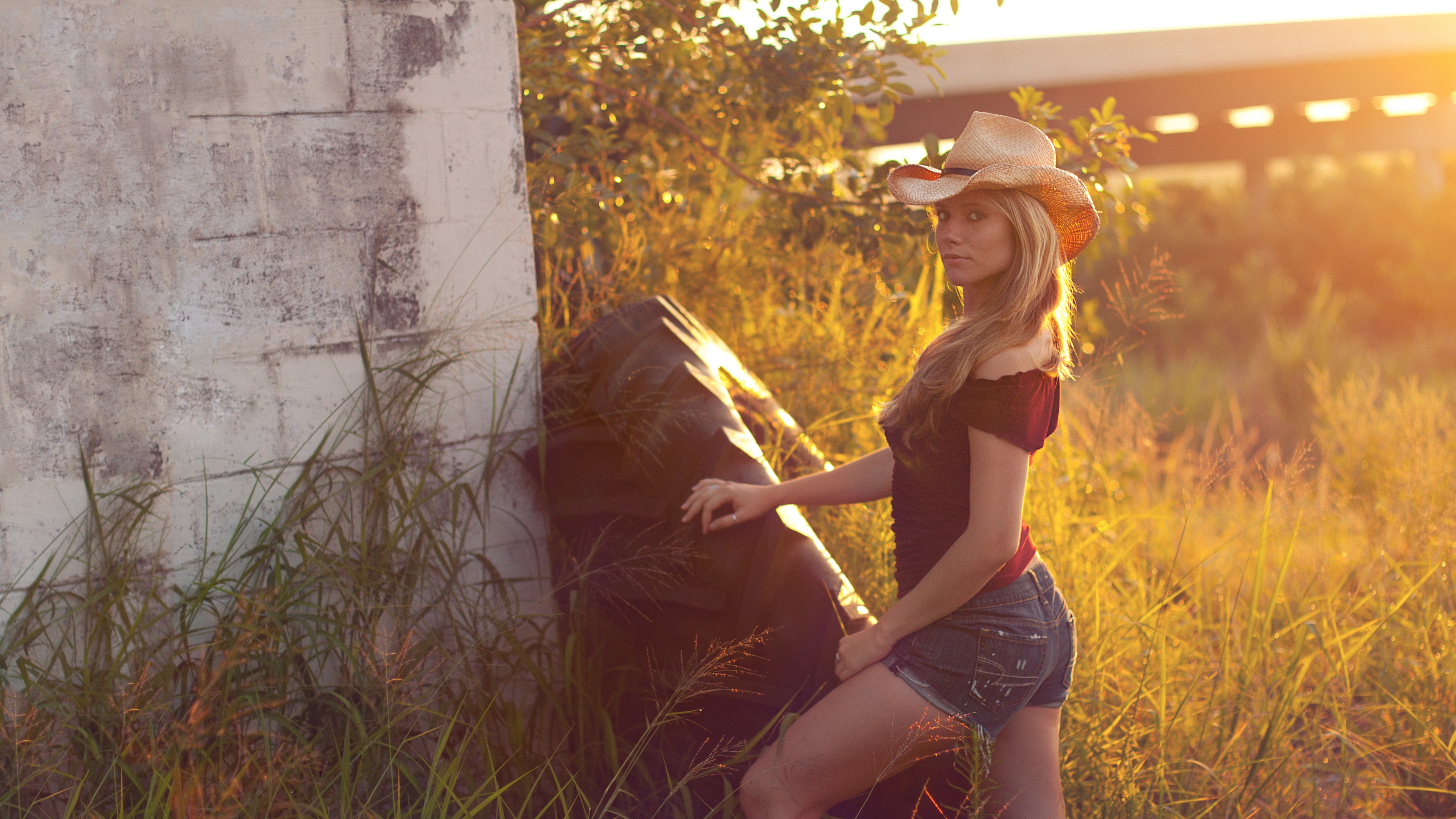 Description: A woman in a hat leaning against a wall with a horse behind her in a field of tall grass.