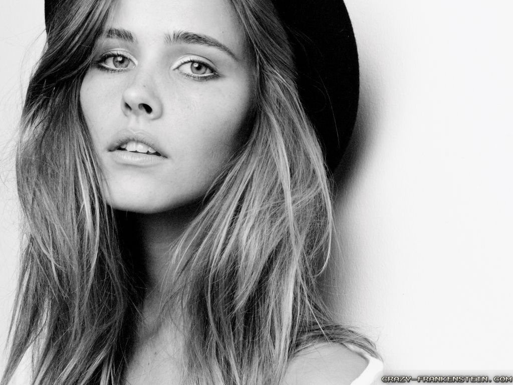Description: A woman with long hair wearing a hat and posing for a picture in black and white photo shoot with a white wall.