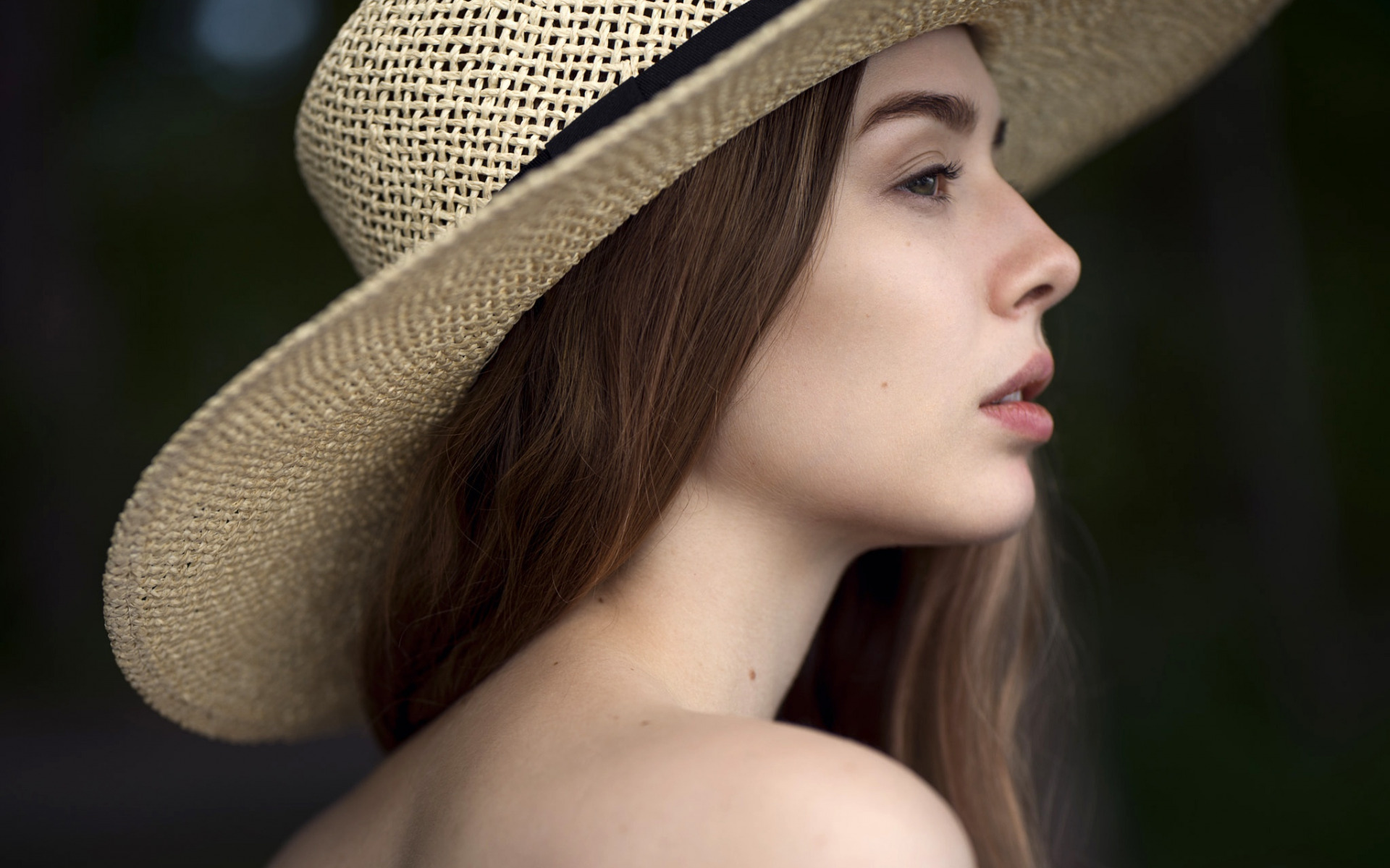 Description: A woman wearing a hat with a long hair and a large breast is looking away from the camera with a serious look on her face.