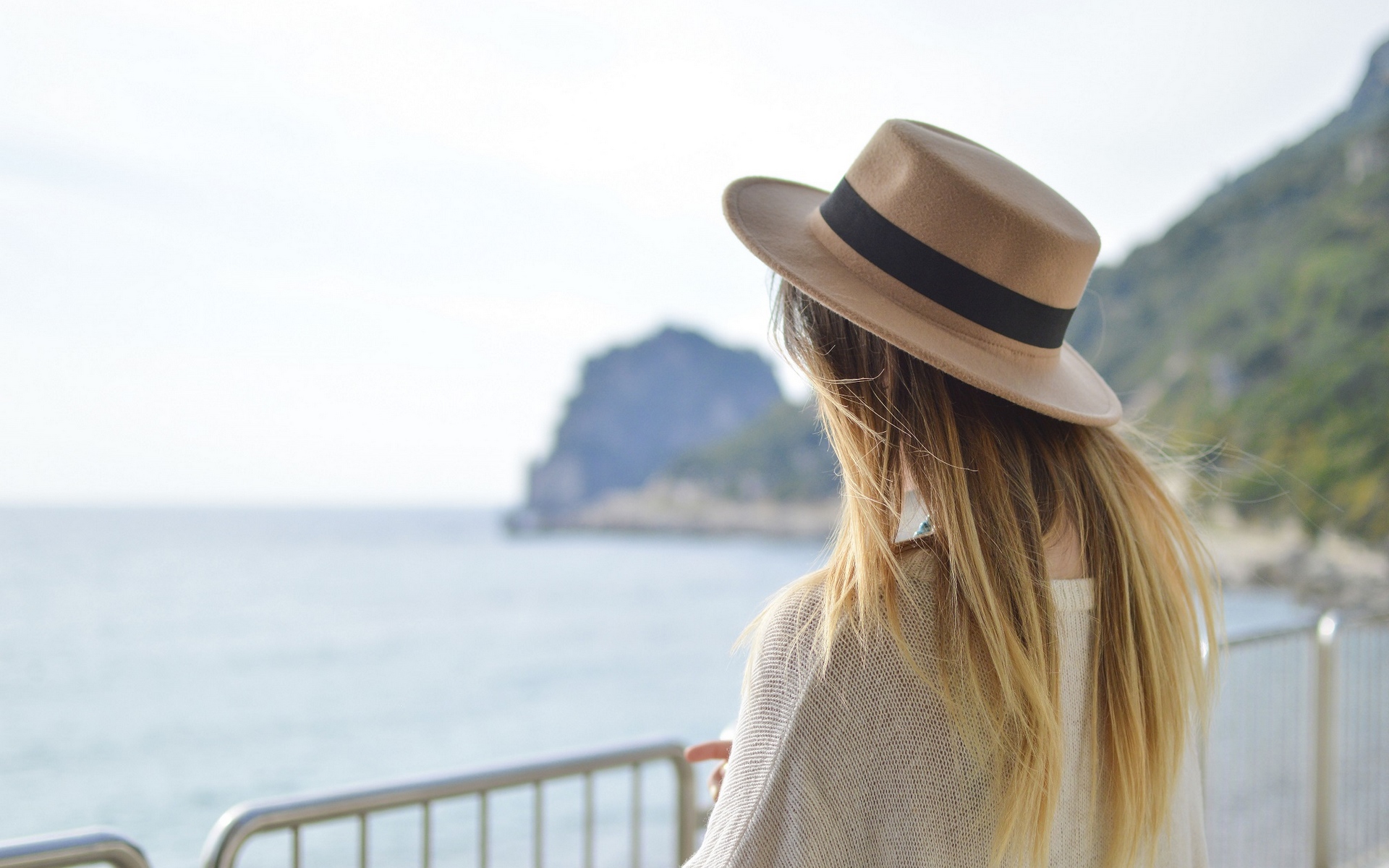 Description: A woman with long hair wearing a hat looking out at the ocean from a balcony overlooking a cliff side.