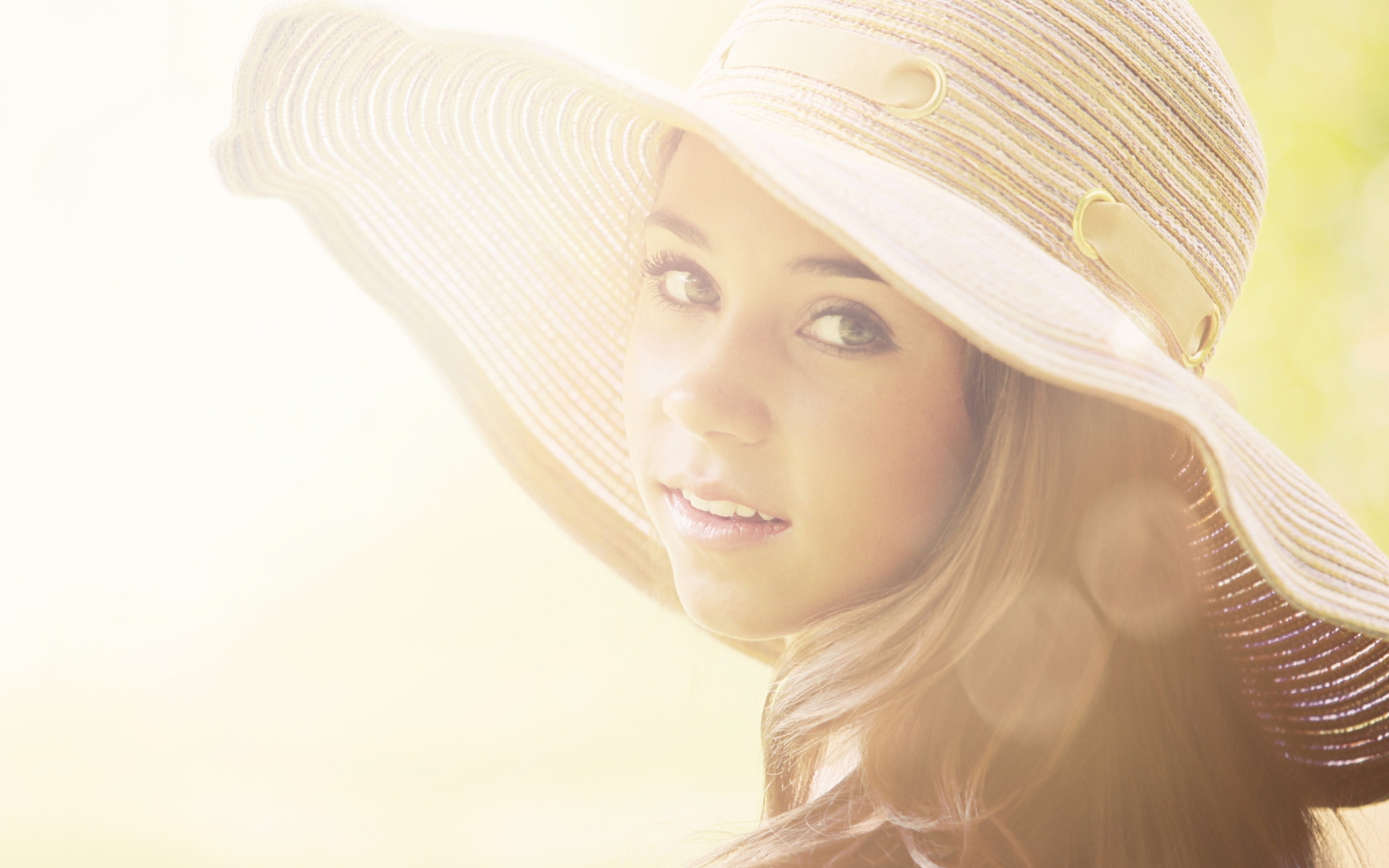 Description: A woman wearing a hat and posing for a picture in the sun with her eyes closed and her hair in a ponytail.