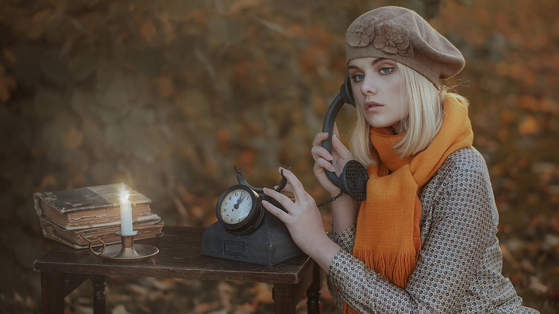 Description: A woman in a hat and scarf holding a clock and a candle on a table with a book on it.