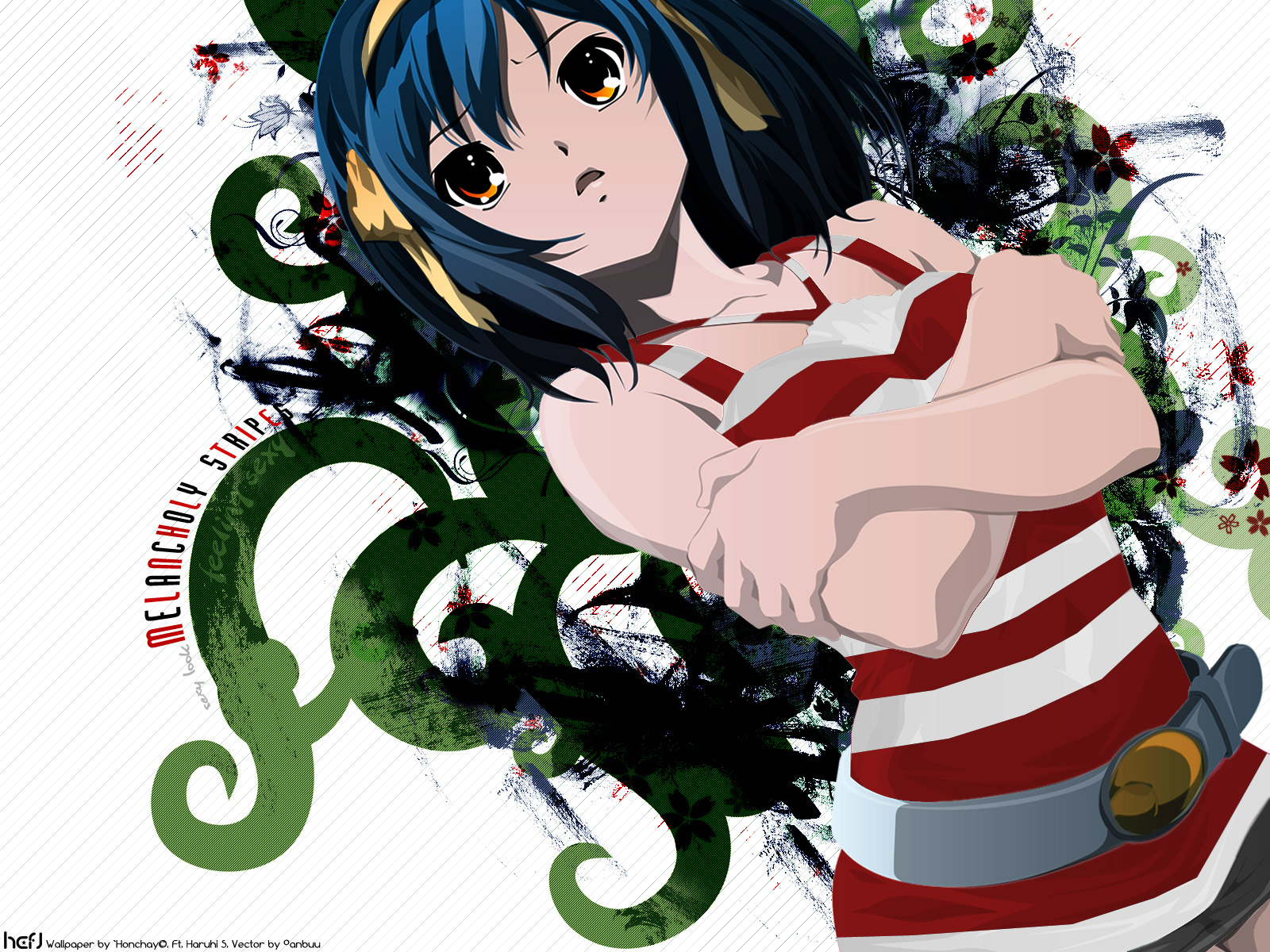 Description: A woman with a hat and a striped shirt is posing for a picture with a green and red background.