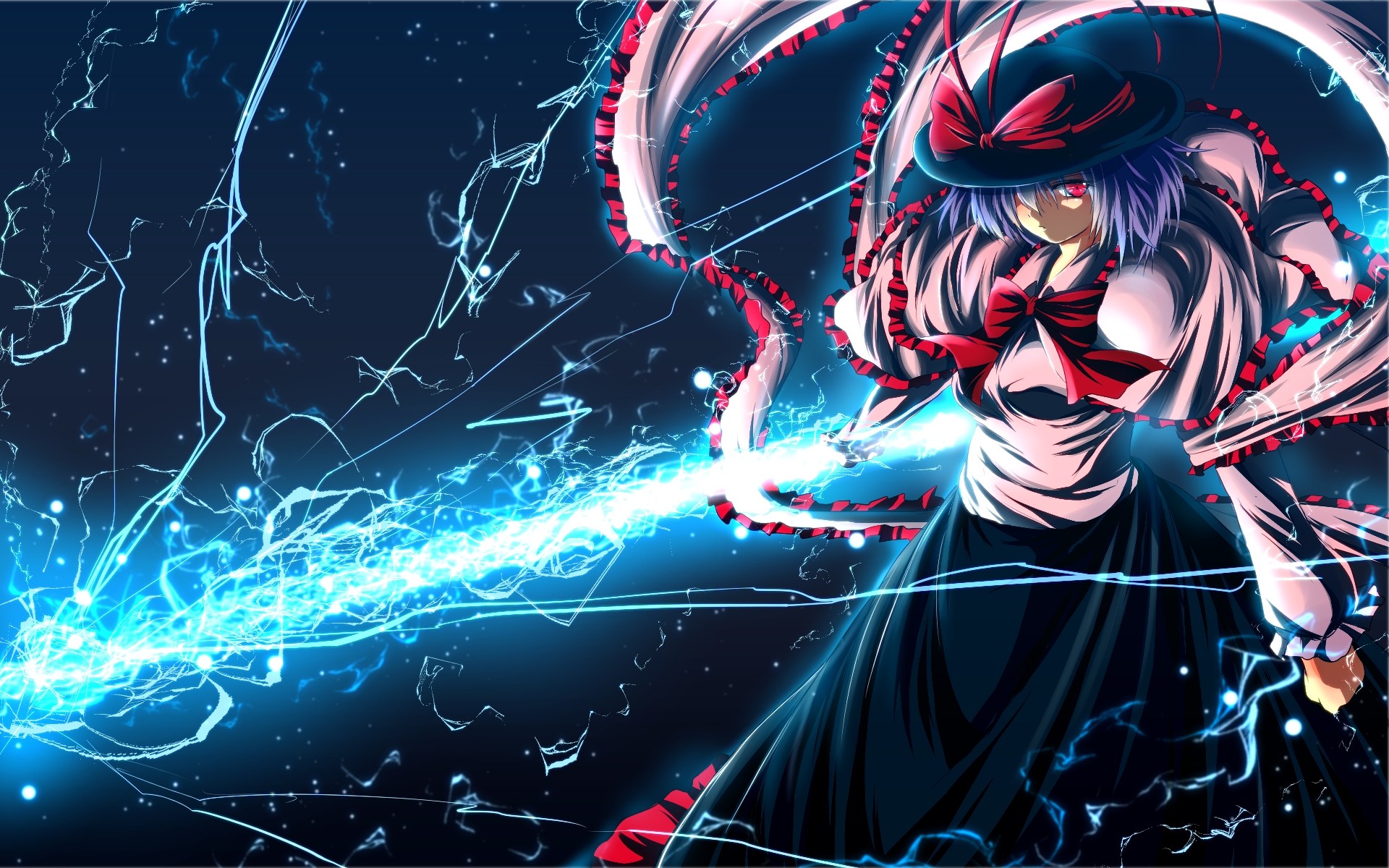 Description: A woman with a hat and a long dress holding a sword in her hands and a blue background with blue lines.